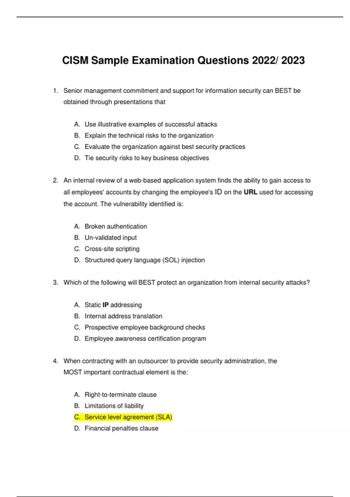 CISM Sample Examination Questions 2023.1. Senior management commitment and support for information security can BEST be obtained through presentations that A. Use illustrative examples of successful attacks B. Explain the technical risks to the organization C. Evaluate the organization against best security practices D. Tie security risks to key business objectives 2. An internal review of a web-based application system finds the ability to gain access to all employees' accounts by changing the employee's ID on the URL used for accessing the account. The vulnerability identified is: A. Broken authentication B. Un-validated input C. Cross-site scripting D. Structured query language (SOL) injection 3. Which of the following will BEST protect an organization from internal security attacks? A. Static IP addressing B. Internal address translation C. Prospective employee background checks D. Employee awareness certification program 4. When contracting with an outsourcer to provide security administration, the MOST important contractual element is the: A. Right-to-terminate clause B. Limitations of liability C. Service level agreement (SLA) D. Financial penalties clause