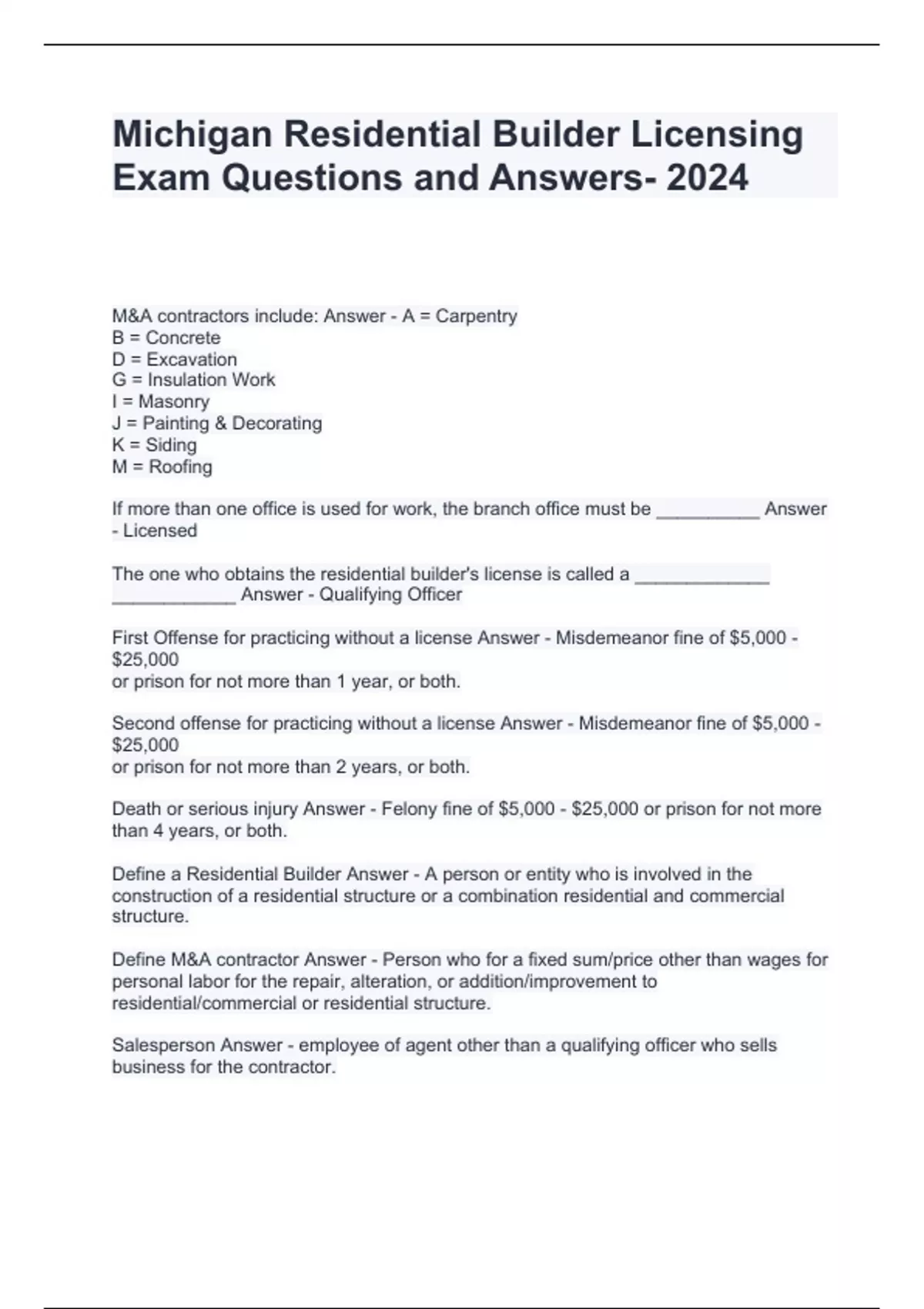 Michigan Residential Builder Licensing Exam Questions and Answers