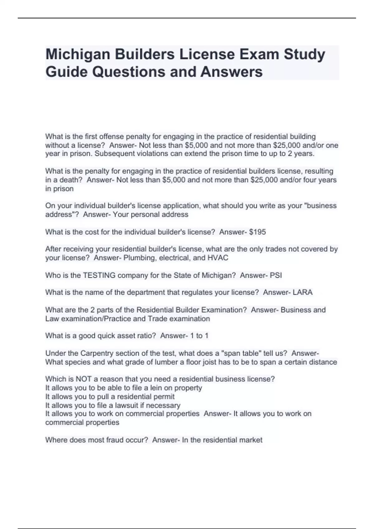 Michigan Builders License Exam Study Guide Questions and Answers