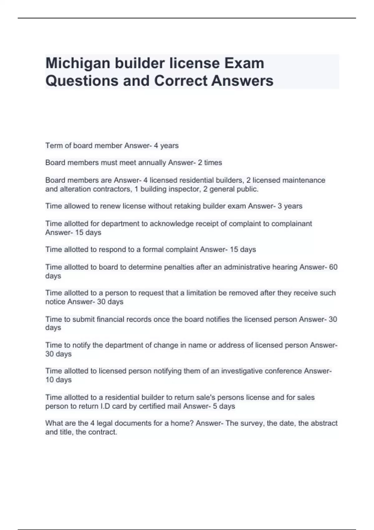 Michigan builder license Exam Questions and Correct Answers