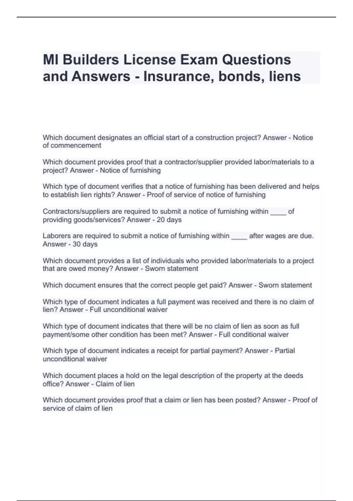 MI Builders License Exam Questions and Answers - Insurance, bonds, liens