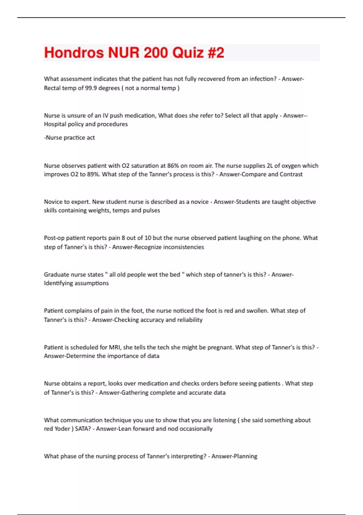 What assessment indicates that the patient has not fully recovered from an infection? - AnswerRectal temp of 99.9 degrees ( not a normal temp ) Nurse is unsure of an IV push medication, What does she refer to? Select all that apply - Answer-- Hospital policy and procedures -Nurse practice act Nurse observes patient with O2 saturation at 86% on room air. The nurse supplies 2L of oxygen which improves O2 to 89%. What step of the Tanner's process is this? - Answer-Compare and Contrast Novice to expert. New student nurse is described as a novice - Answer-Students are taught objective skills containing weights, temps and pulses Post-op patient reports pain 8 out of 10 but the nurse observed patient laughing on the phone. What step of Tanner's is this? - Answer-Recognize inconsistencies Graduate nurse states " all old people wet the bed " which step of tanner's is this? - AnswerIdentifying assumptions Patient complains of pain in the foot, the nurse noticed the foot is red and swollen. What step of Tanner's is this? - Answer-Checking accuracy and reliability Patient is scheduled for MRI, she tells the tech she might be pregnant. What step of Tanner's is this? - Answer-Determine the importance of data Nurse obtains a report, looks over medication and checks orders before seeing patients . What step of Tanner's is this? - Answer-Gathering complete and accurate data What communication technique you use to show that you are listening ( she said something about red Yoder ) SATA? - Answer-Lean forward and nod occasionally What phase of the nursing process of Tanner's interpreting? - Answer-PlanningThe nurses believes that the patient is lonely and depressed over his wife's death. The nurse is exhibiting which stop of the Tanner's model of clinical judgement? - Answer-Identifying assumptions The nurse believes that the patients CHF has gotten better so she checks his most recent labs and sees that his BNP has decreased significantly. The nurse has used which step in the Tanner's model of clinical judgement? - Answer-Recognizing inconsistencies The nurse has planned for POD number one patient to get OOB for every meal as tolerated. She has also instructed the patient to see the DD and use the IS every 2 hours while awake and not miss his respiratory treatment. What step of Tanner's model is this? - Answer-Predicting and managing potential complications The nurse notices her patient have a facial grimacing as she passes the room. What is the next thing the nurse should do? - Answer-Approach the patient and ask if everything is OK You are a nurse at the mall shopping for gifts and you notice a person with a hand on their chest and appears to be having difficulty breathing. Which action using Tanner's nursing skill checking accuracy and reliability will the nurse take next? - Answer-Call for help and get the AED Pt with necrotizing fasciitis is post day one after surgical debridement. The Pt is drowsy but responsive and moans when touched. When changing the dressing the Pt does not make any facial expressions to let you know they are in pain. The nurse uses critical thinking and determine which significant inconsistency in the assessment of the patient? - Answer-Patient has no reaction to the removal of packing A nurse believes an elderly patient is depressed when they say , I feel old and alone - AnswerIdentifying assumptions Patient is having difficulty seeing the lines on an insulin syringe - Answer-Predicting and managing potential complications A nurse is reviewing WBC, DS, assessment to determine if the patient has an infection - AnswerGathering complete and accurate data A nurse completes a head to toe assessment followed by a focused assessment for hours later of a patient with a head injury - Answer-Assessing systematically and comprehensively