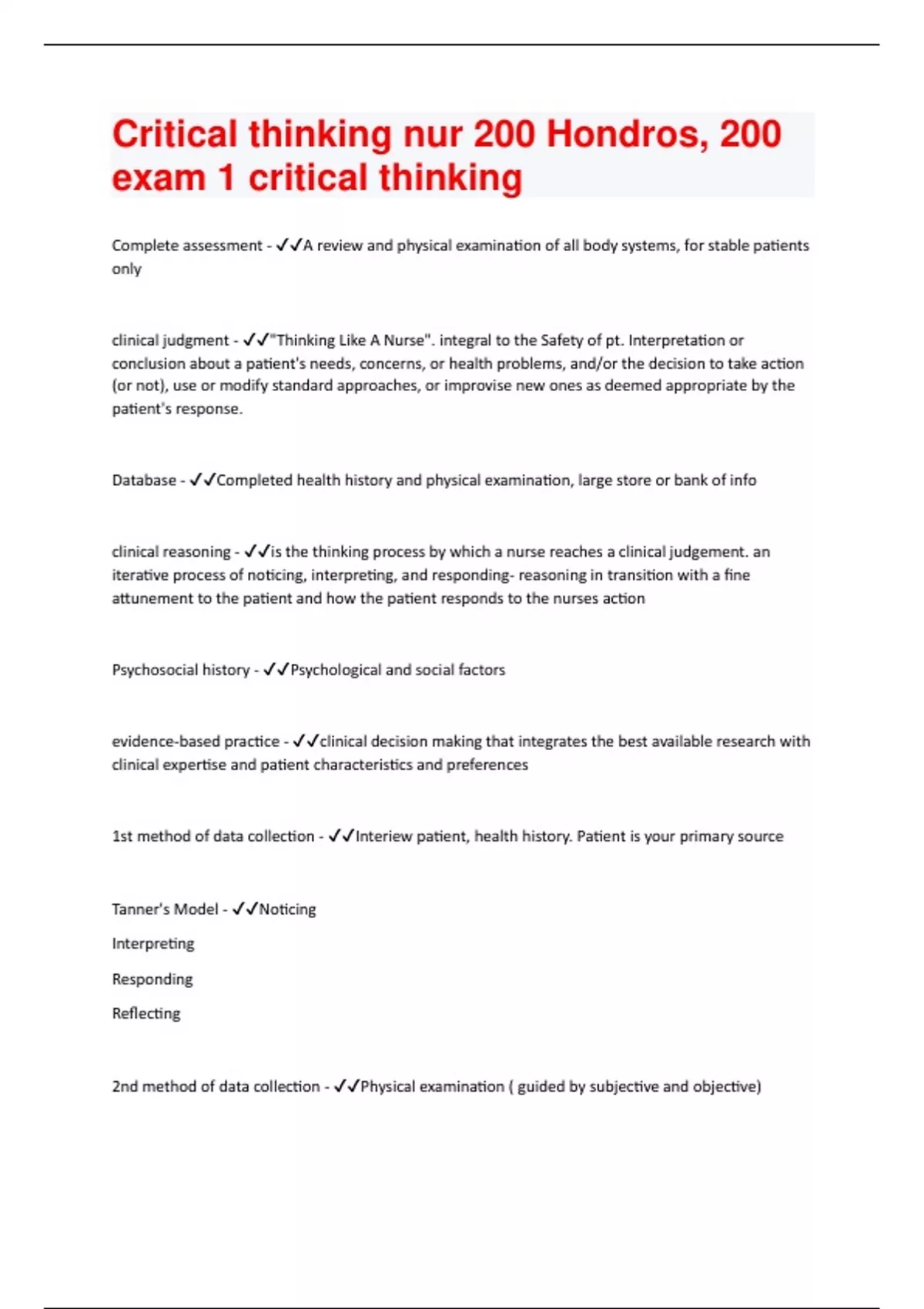 Critical thinking nur 200 Hondros, 200 exam 1 critical thinking Questions And Answers Rated A+ New Update Assured Satisfaction