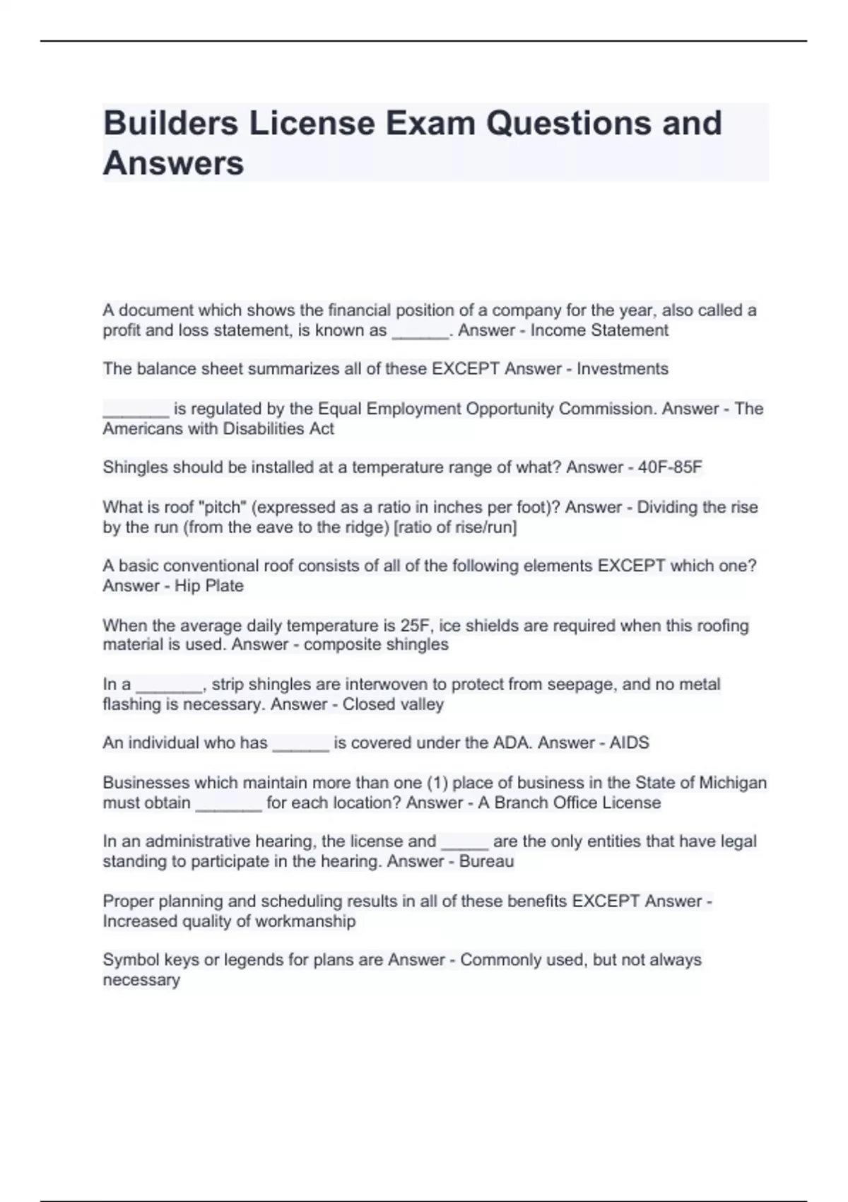 Builders License Exam Questions and Answers
