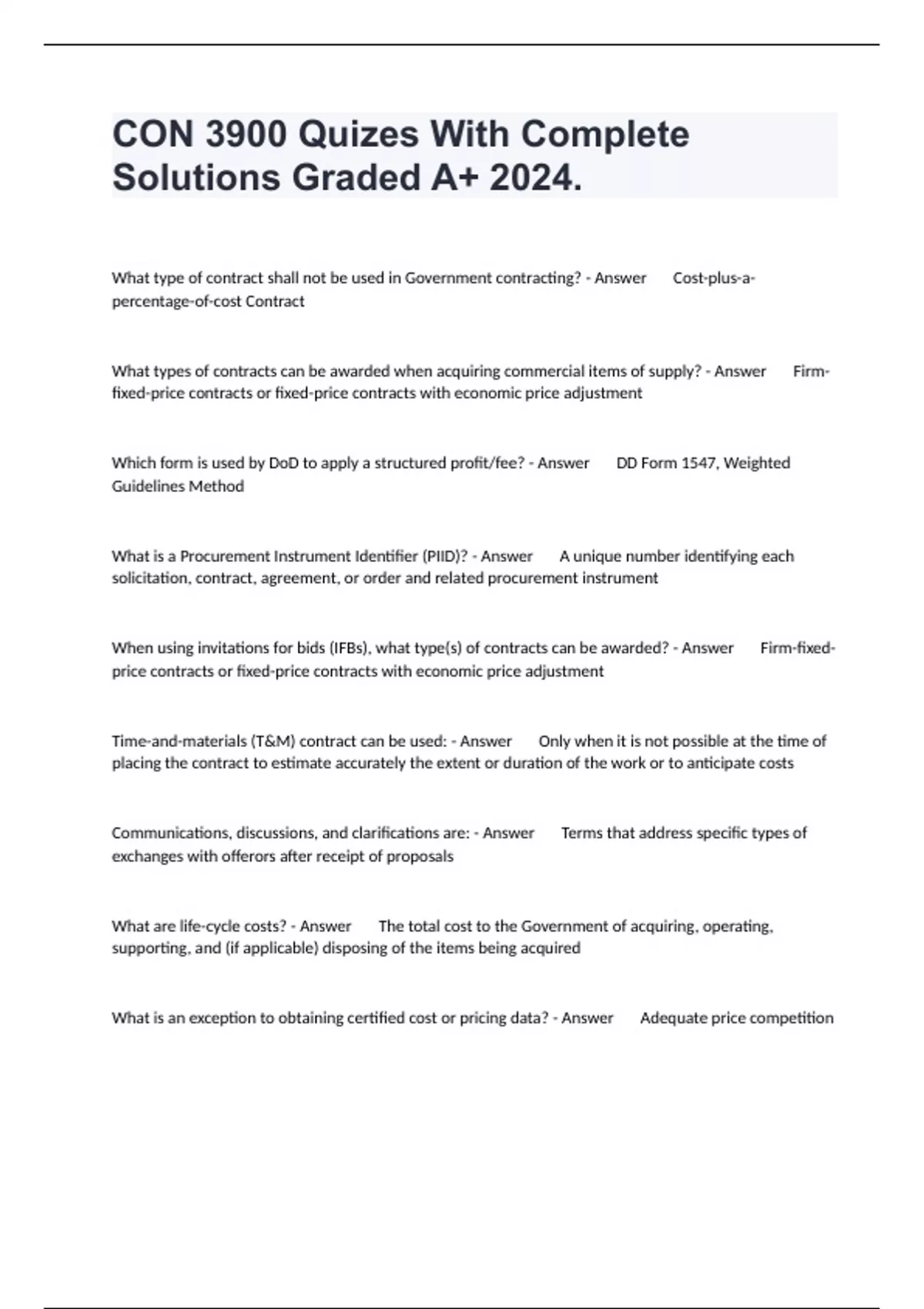 What type of contract shall not be used in Government contracting? - Answer Cost-plus-a-percentage-of-cost Contract What types of contracts can be awarded when acquiring commercial items of supply? - Answer Firm-fixed-price contracts or fixed-price contracts with economic price adjustment Which form is used by DoD to apply a structured profit/fee? - Answer DD Form 1547, Weighted Guidelines Method What is a Procurement Instrument Identifier (PIID)? - Answer A unique number identifying each solicitation, contract, agreement, or order and related procurement instrument When using invitations for bids (IFBs), what type(s) of contracts can be awarded? - Answer Firm-fixed-price contracts or fixed-price contracts with economic price adjustment Time-and-materials (T&M) contract can be used: - Answer Only when it is not possible at the time of placing the contract to estimate accurately the extent or duration of the work or to anticipate costs Communications, discussions, and clarifications are: - Answer Terms that address specific types of exchanges with offerors after receipt of proposals What are life-cycle costs? - Answer The total cost to the Government of acquiring, operating, supporting, and (if applicable) disposing of the items being acquired What is an exception to obtaining certified cost or pricing data? - Answer Adequate price competition