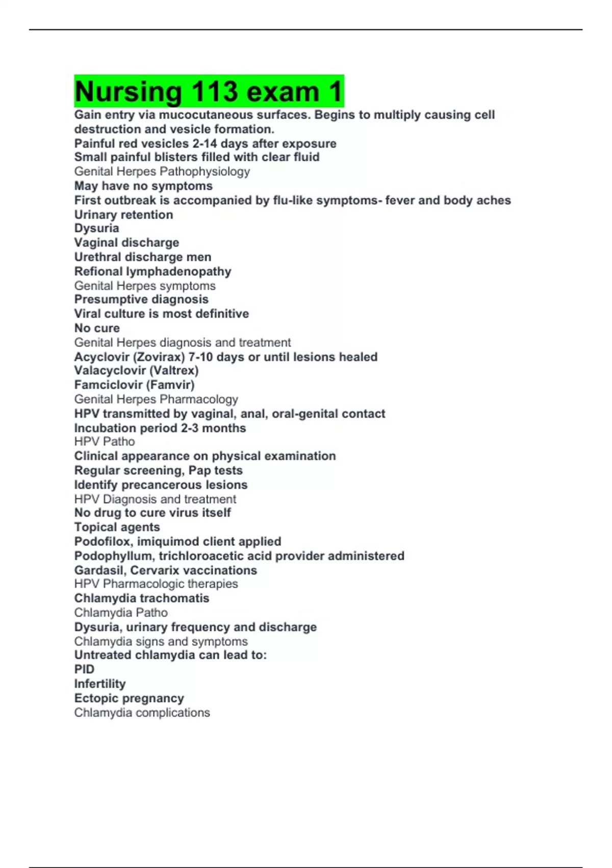 Nursing 113 exam 1 Gain entry via mucocutaneous surfaces. Begins to multiply causing cell destruction and vesicle formation. Painful red vesicles 2-14 days after exposure Small painful blisters filled with clear fluid Genital Herpes Pathophysiology May have no symptoms First outbreak is accompanied by flu-like symptoms- fever and body aches Urinary retention Dysuria Vaginal discharge Urethral discharge men Refional lymphadenopathy Genital Herpes symptoms Presumptive diagnosis Viral culture is most definitive No cure Genital Herpes diagnosis and treatment Acyclovir (Zovirax) 7-10 days or until lesions healed Valacyclovir (Valtrex) Famciclovir (Famvir) Genital Herpes Pharmacology HPV transmitted by vaginal, anal, oral-genital contact Incubation period 2-3 months HPV Patho Clinical appearance on physical examination Regular screening, Pap tests Identify precancerous lesions HPV Diagnosis and treatment No drug to cure virus itself Topical agents Podofilox, imiquimod client applied Podophyllum, trichloroacetic acid provider administered Gardasil, Cervarix vaccinations HPV Pharmacologic therapies Chlamydia trachomatis Chlamydia Patho Dysuria, urinary frequency and discharge Chlamydia signs and symptoms Untreated chlamydia can lead to: PID Infertility Ectopic pregnancy Chlamydia complications PCR test Nucleic acid hybridization test Chlamydia diagnosis Azithromycin (Zithromax), doxycycline ( Causes Diarrhea) Both partners treated Chlamydia Pharmacologic therapy Pyogenic bacteria that causes inflammation In men, acute pain Epididymus, periurethral glands In women PID, endometritis, salpingitis, pelvic peritonitis Gonorrhea Patho Men Dysuria, serous, milky, purulent penile discharge Women Dysuria, urinary frequency, abnormal menses Increased vaginal discharge, dyspareunia Anorectal gonorrhea Pruritis, mucopurulent discharge, bleeding, pain Gonococcal pharyngitis Gonnorrhea signs and symptoms Blindness, infection of joints, potentially lethal Gonorrhea Complications in Newborns PID in women Epididymitis, prostatitis in men Spread of infection to blood, joints Increased susceptibility to, transmission of HIV Gonorrhea complications Cultures Urinalysis Gram stain Tests for other STI Gonorrhea Diagnositics Eradication of organism Prevention of reinfection or transmission other STIs Gonorrhea Treatment Break in skin, mucous membrane Spread through blood, lymphatic system Congenital syphilis Transferred to fetus through placental circulation Syphilis Patho Chancre, regional lymph node enlargement 3-4 weeks after infectious contact Little or no pain Highly infectious Primary syphilis 6 weeks after initial chancre Systemic with spirochete spreading to all major organ systems Skin rash, mucous patches in oral cavity, sore throat Generalized lympadenopathy, condyloma lata Secondary syphilis 2 or more years after initial infection Sexual transmission is possible in latent syphilis Two types Benign late syphilis Diffuse inflammatory response Latent and tertiary syphilis Venereal Disease Research Laboratory (VDRL) FTA-ABS confirmatory Syphilis diagnosis Penicillin G IM in single dose Treatment may result in Jarisch-Herxheimer reaction Syphilis treatment stop/limit smoking limit caffeine, Alcohol, social drugs street drugs pose real threat to the fetus Women with chronic health disorders such as thyroid disease, seizures, hypertension, and diabetes should talk to the doctor before having a baby ( some medications may need to be changed for the safety of fetus) Preconception teaching both partners should have a physical and a dental exam prior to pregnancy to avoid any necessary procedures that may cause harm to the fetus preconception physical calcium protein iron b complex vitamin vitamin c magnesium folic acid ( do not exceed recommended doses of these) Preconception nurtrition Based on understanding of ovulatory cycle takes in account that sperms life spand is 3-6 days and ovum lifespand is 1-3 days Extensive initial counseling to be effective Calendar rhythm method Requires a period of abstinence and recording certian events throughout cycle Least reliable Natural family planning Acceptable to religious beliefs Free increased awareness of body no artificial substances or devices in body encourages couple communication Natural family planning pros may interfere with spontaneity careful records must be kept may be difficult/impossible for women who don't have normal cycle not very reliable Natural family planning cons women record menstrual cycle for 6 months to identify shortest and longest cycle fertile phase is 18 days before the end of the shortest cycle and 11 days before the longest calendar rhythm Woman takes BBT on awakening Before activity Record on graph Based on fact that temperature : Sometimes drops before ovulation and Almost always rises, remains elevated afterward Basal body temperature (BBT) method need a specific thermometer must record for 3-4 months to establish a cycle must abstain from intercourse for several days Basal body temperature (BBT) method cons Assessment of cervical mucus changes With ovulation mucus clearer, more stretchable Spinnbarkeit (quality) Fern pattern Abstain from intercourse: From mucus becoming clear, more elastic Until 4 days after last wet mucus Ovulation method