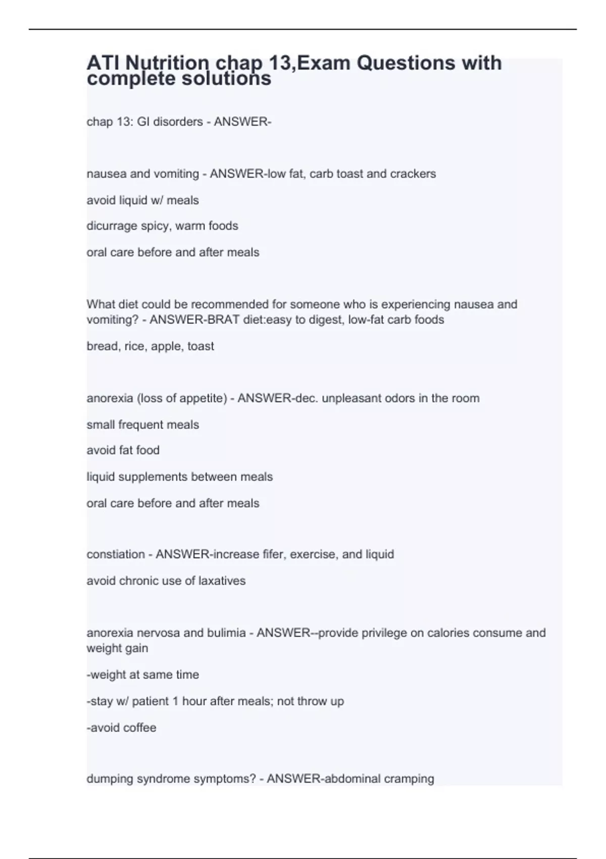 chap 13: GI disorders - ANSWER- nausea and vomiting - ANSWER-low fat, carb toast and crackers avoid liquid w/ meals dicurrage spicy, warm foods oral care before and after meals What diet could be recommended for someone who is experiencing nausea and vomiting? - ANSWER-BRAT diet:easy to digest, low-fat carb foods bread, rice, apple, toast anorexia (loss of appetite) - ANSWER-dec. unpleasant odors in the room small frequent meals avoid fat food liquid supplements between meals oral care before and after meals constiation - ANSWER-increase fifer, exercise, and liquid avoid chronic use of laxatives anorexia nervosa and bulimia - ANSWER--provide privilege on calories consume and weight gain -weight at same time -stay w/ patient 1 hour after meals; not throw up -avoid coffee dumping syndrome symptoms? - ANSWER-abdominal cramping nausea diarrhea diaphoresis hypotension