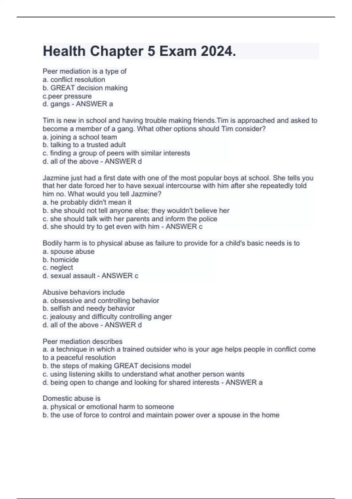 Health Chapter 5 Exam 2024. Peer mediation is a type of a. conflict resolution b. GREAT decision making pressure d. gangs - ANSWER a Tim is new in school and having trouble making friends.Tim is approached and asked to become a member of a gang. What other options should Tim consider? a. joining a school team b. talking to a trusted adult c. finding a group of peers with similar interests d. all of the above - ANSWER d Jazmine just had a first date with one of the most popular boys at school. She tells you that her date forced her to have sexual intercourse with him after she repeatedly told him no. What would you tell Jazmine? a. he probably didn't mean it b. she should not tell anyone else; they wouldn't believe her c. she should talk with her parents and inform the police d. she should try to get even with him - ANSWER c Bodily harm is to physical abuse as failure to provide for a child's basic needs is to a. spouse abuse b. homicide c. neglect d. sexual assault - ANSWER c Abusive behaviors include a. obsessive and controlling behavior b. selfish and needy behavior c. jealousy and difficulty controlling anger d. all of the above - ANSWER d