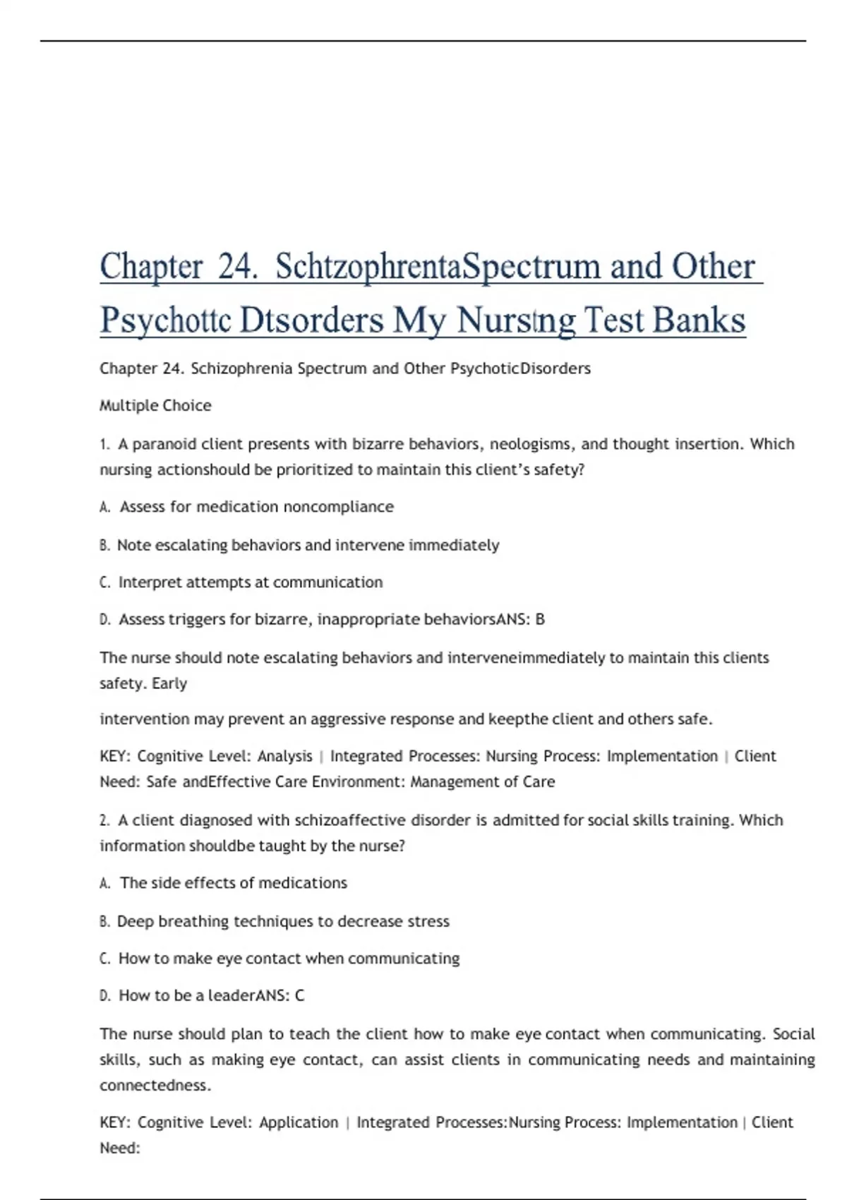 Chapter 24. Schizophrenia Spectrum and Other Psychotic Disorders Multiple Choice 1. A paranoid client presents with bizarre behaviors, neologisms, and thought insertion. Which nursing action should be prioritized to maintain this client’s safety? A. Assess for medication noncompliance B. Note escalating behaviors and intervene immediately C. Interpret attempts at communication D. Assess triggers for bizarre, inappropriate behaviors ANS: B The nurse should note escalating behaviors and intervene immediately to maintain this clients safety. Early intervention may prevent an aggressive response and keep the client and others safe. KEY: Cognitive Level: Analysis | Integrated Processes: Nursing Process: Implementation | Client Need: Safe and Effective Care Environment: Management of Care 2. A client diagnosed with schizoaffective disorder is admitted for social skills training. Which information should be taught by the nurse? A. The side effects of medications B. Deep breathing techniques to decrease stress C. How to make eye contact when communicating D. How to be a leader ANS: C The nurse should plan to teach the client how to make eye contact when communicating. Social skills, such as making eye contact, can assist clients in communicating needs and maintaining connectedness. KEY: Cognitive Level: Application | Integrated Processes: Nursing Process: Implementation | Client Need: Psychosocial Integrity 3. A 16-year-old client diagnosed with schizophrenia experiences command hallucinations to harm others. The clients parents ask a nurse, Where do the voices come from? Which is the appropriate nursing reply? A. Your child has a chemical imbalance of the brain, which leads to altered thoughts. B. Your childs hallucinations are caused by medication interactions. C. Your child has too little serotonin in the brain, causing delusions and hallucinations. D. Your childs abnormal hormonal changes have precipitated auditory hallucinations. ANS: A The nurse should explain that a chemical imbalance of the brain leads to altered thought processes. Hallucinations, or false sensory perceptions, may occur in all five senses. The client who hears voices is experiencing an auditory hallucination. KEY: Cognitive Level: Application | Integrated Processes: Teaching/Learning | Client Need: Health Promotion and Maintenance 4. Parents ask a nurse how they should reply when their child, diagnosed with schizophrenia, tells them that voices command him to harm others. Which is the appropriate