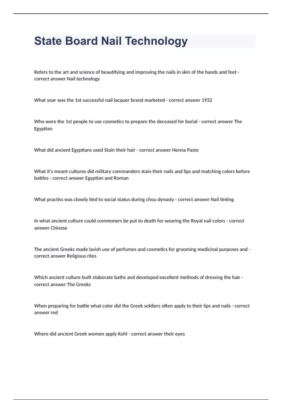 State Board Nail TechnologyRefers to the art and science of beautifying and improving the nails in skin of the hands and feet - correct answer Nail technology What year was the 1st successful nail lacquer brand marketed - correct answer 1932 Who were the 1st people to use cosmetics to prepare the deceased for burial - correct answer The Egyptian What did ancient Egyptians used Stain their hair - correct answer Henna Paste What it's meant cultures did military commanders stain their nails and lips and matching colors before battles - correct answer Egyptian and Roman What practiss was closely tied to social status during chou dynasty - correct answer Nail tinting In what ancient culture could commoners be put to death for wearing the Royal nail colors - correct answer Chinese The ancient Greeks made lavish use of perfumes and cosmetics for grooming medicinal purposes and - correct answer Religious rites Which ancient culture built elaborate baths and developed excellent methods of dressing the hair - correct answer The Greeks When preparing for battle what color did the Greek soldiers often apply to their lips and nails - correct answer red Where did ancient Greek women apply Kohl - correct answer their eyes