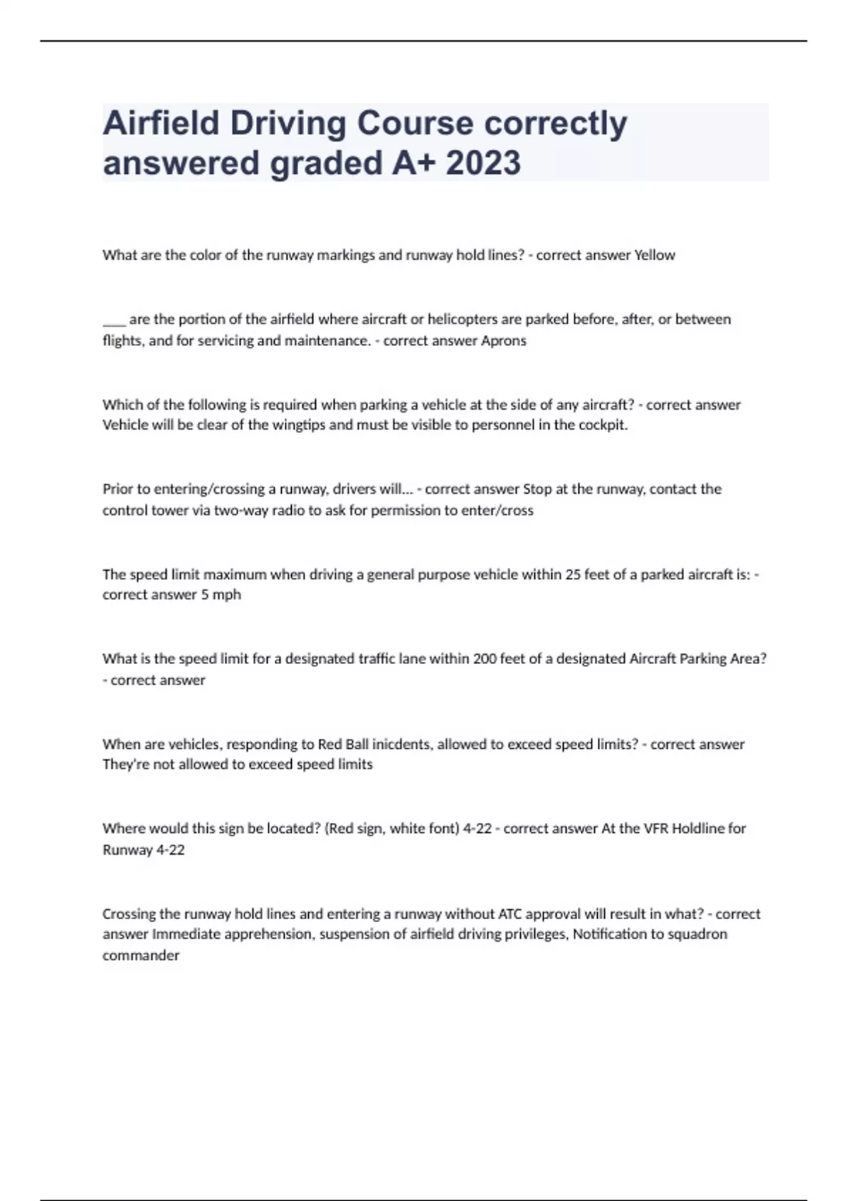 Airfield Driving Course correctly answered graded A+ 2024