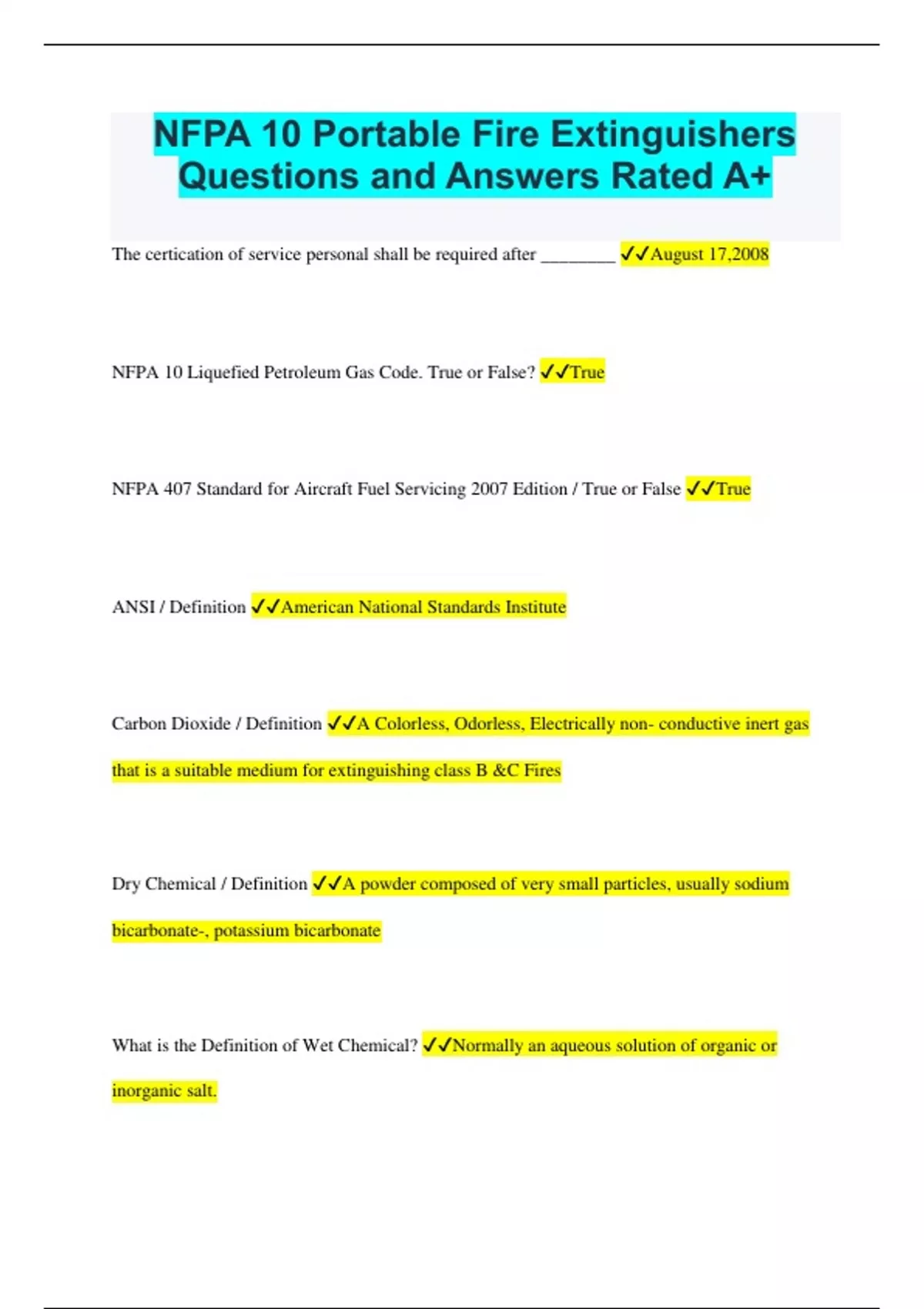 NFPA 10 Portable Fire Extinguishers Questions and Answers Rated A+ The certication of service personal shall be required after ________ August 17,2008 NFPA 10 Liquefied Petroleum Gas Code. True or False? True NFPA 407 Standard for Aircraft Fuel Servicing 2007 Edition / True or False True ANSI / Definition American National Standards Institute Carbon Dioxide / Definition A Colorless, Odorless, Electrically non- conductive inert gas that is a suitable medium for extinguishing class B &C Fires Dry Chemical / Definition A powder composed of very small particles, usually sodium bicarbonate-, potassium bicarbonate What is the Definition of Wet Chemical? Normally an aqueous solution of organic or inorganic salt. What are the two Extinguisher Chemicals Wet and Dry What are the two Closed Recovery System Dry and Halogenated A System that is constructed in a manner that does not introduce foreign material into the agent being recovered and has a means of visually inspecting the recovered agent for contaminants. Dry Chemical Closed Recovery System A system that provides for the transfer of halogenated agents between fire extinguishers, supply containers, and recharge and recovery containers so that none of the halogenated agent escapes to the atmosphere Halogenated Closed Recovery System What are the two types of Cylinders High & Low Pressure Cylinders Cylinders or Cartridges containing nitrogen, compress air, carbon dioxide, or other gases at a presser higher than 500 psi at 70 Degrees High-Pressure Cylinder A Cylinder containing fire extinguishing agent (medium) , nitrogen compressed air,or other compressed gases at a service pressure of 500 psi or at70 degrees Low-Pressure Cylinder What is a Ordinary combustibles extinguisher Class "A" extinguisher Flammable and combustible liquids and gases extinguisher? Class "B" extinguisher Electrical extinguisher? Class "C" extinguisher Combustible metals extinguisher? Class "D" extinguisher Kitchen extinguisher? Class "K" extinguisher What is the color rating of a D Class fire extinguisher? Yellow Aqueous film foaming foam extinguishers are suitable for use on Class ___ and Class ___ fires. A;B CO2 extinguishers are effective in extinguishing Class ___ and Class___ fires B;C A Sodium Bicarbonate extinguisher is a ____ type of fire extinguisher Dry Chemical Class ___ agents cannot be given multi-purpose rating for use on other classes. D Dry powder agents are for Class ____ fires only D NFPA ___, Standard for portable fire extinguishers, provides information on rating, placement, and use of portable extinguishers 10 The mixing of ____ and water results in a vapor seal