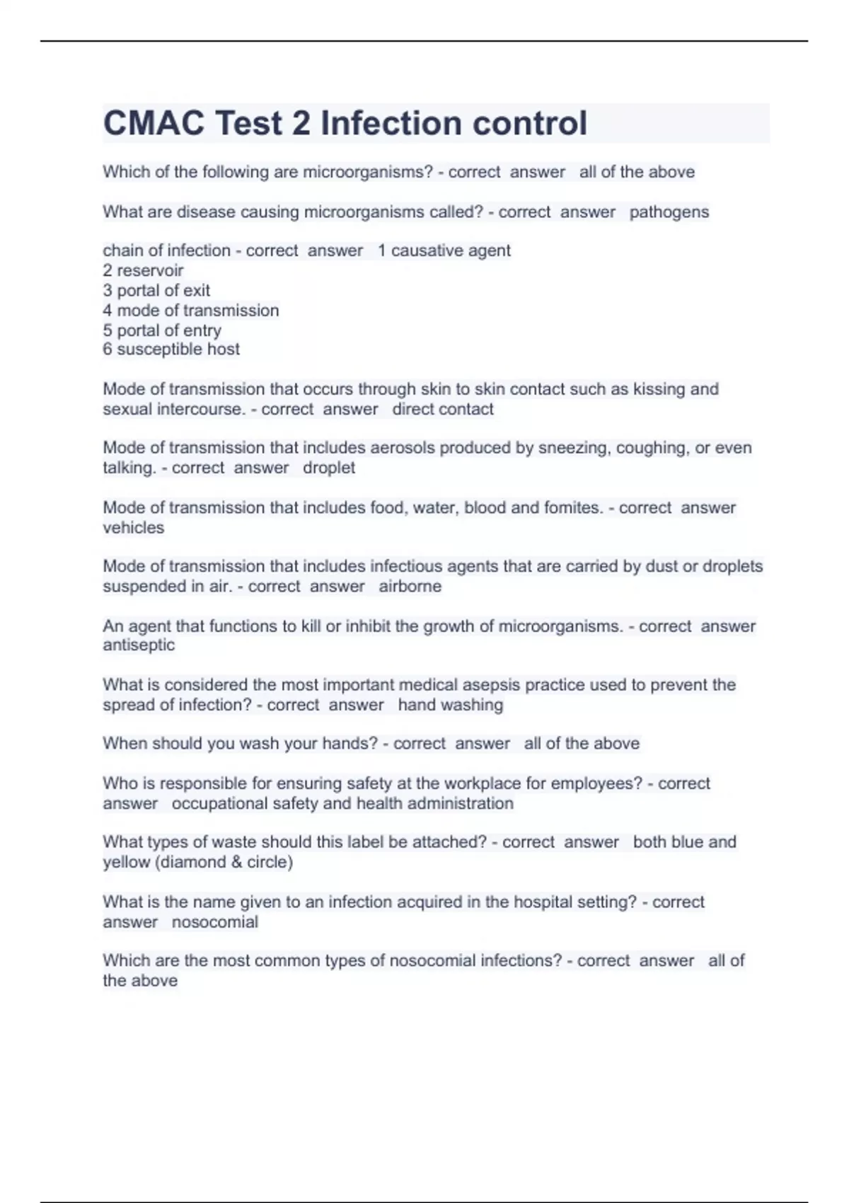 CMAC CONTROL OF INFECTION QUESTIONS AND CORRECT VERIFIED ANSWERS 2023/2024 Which of the following are microorganisms? - correct answer all of the above What are disease causing microorganisms called? - correct answer pathogens chain of infection - correct answer 1 causative agent 2 reservoir 3 portal of exit 4 mode of transmission 5 portal of entry 6 susceptible host Mode of transmission that occurs through skin to skin contact such as kissing and sexual intercourse. - correct answer direct contact Mode of transmission that includes aerosols produced by sneezing, coughing, or even talking. - correct answer droplet Mode of transmission that includes food, water, blood and fomites. - correct answer vehicles Mode of transmission that includes infectious agents that are carried by dust or droplets suspended in air. - correct answer airborne An agent that functions to kill or inhibit the growth of microorganisms. - correct answer antiseptic What is considered the most important medical asepsis practice used to prevent the spread of infection? - correct answer hand washing When should you wash your hands? - correct answer all of the above Who is responsible for ensuring safety at the workplace for employees? - correct answer occupational safety and health administration What types of waste should this label be attached? - correct answer both blue and yellow (diamond & circle) What is the name given to an infection acquired in the hospital setting? - correct answer nosocomial Which are the most common types of nosocomial infections? - correct answer all of the above What disease if caused by inflammation of the liver & OSHA requires that all at risk employees are provided the vaccine? - correct answer Hepatitis B Most exposures to what disease in healthcare is due to accidental needle sticks? - correct answer HIV