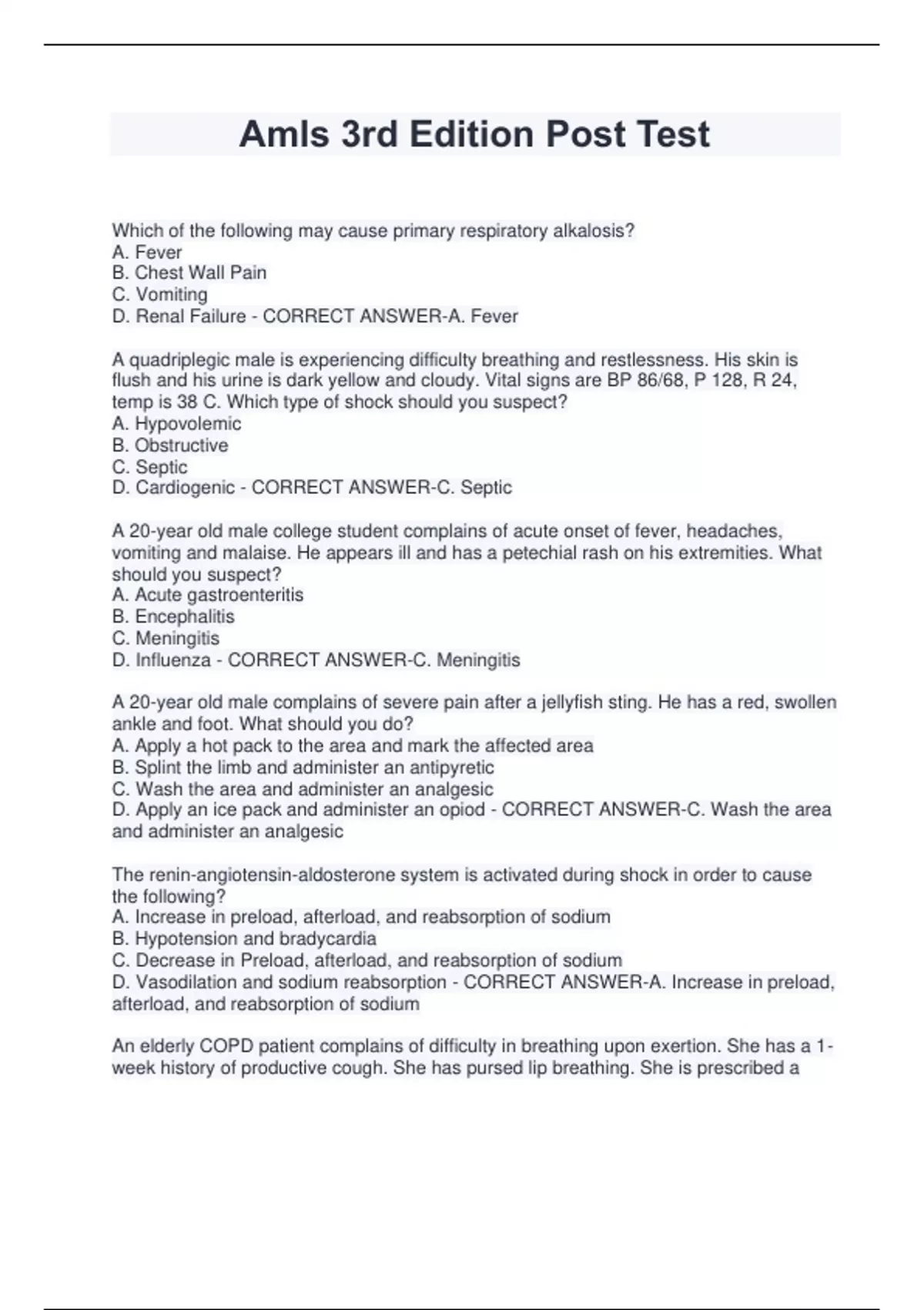 Amls 3rd Edition Post Test Which of the following may cause primary respiratory alkalosis? A. Fever B. Chest Wall Pain C. Vomiting D. Renal Failure - CORRECT ANSWER-A. Fever A quadriplegic male is experiencing difficulty breathing and restlessness. His skin is flush and his urine is dark yellow and cloudy. Vital signs are BP 86/68, P 128, R 24, temp is 38 C. Which type of shock should you suspect? A. Hypovolemic B. Obstructive C. Septic D. Cardiogenic - CORRECT ANSWER-C. Septic A 20-year old male college student complains of acute onset of fever, headaches, vomiting and malaise. He appears ill and has a petechial rash on his extremities. What should you suspect? A. Acute gastroenteritis B. Encephalitis C. Meningitis D. Influenza - CORRECT ANSWER-C. Meningitis A 20-year old male complains of severe pain after a jellyfish sting. He has a red, swollen ankle and foot. What should you do? A. Apply a hot pack to the area and mark the affected area B. Splint the limb and administer an antipyretic C. Wash the area and administer an analgesic D. Apply an ice pack and administer an opiod - CORRECT ANSWER-C. Wash the area and administer an analgesic The renin-angiotensin-aldosterone system is activated during shock in order to cause the following? A. Increase in preload, afterload, and reabsorption of sodium B. Hypotension and bradycardia C. Decrease in Preload, afterload, and reabsorption of sodium D. Vasodilation and sodium reabsorption - CORRECT ANSWER-A. Increase in preload, afterload, and reabsorption of sodium An elderly COPD patient complains of difficulty in breathing upon exertion. She has a 1- week history of productive cough. She has pursed lip breathing. She is prescribed a bronchodilator as needed. Vital signs are BP 132/70, P 88, R 20 with Rhonchi. What should you suspect? A. Pulmonary embolism B. Epiglottitis C. Chronic Bronchitis D. Congestive Heart Failure - CORRECT ANSWER-C. Chronic Bronchitis An anxious 32 year old female complains of chest pain with palpitations. She has a history of Graves' disease. She reports she was seen in the ED earlier that day and has a CT scan of her abdomen with IV contrast. She is diaphoretic and has a temperature of 101.5 F. Vital signs are 100/62 P 156 R30 BGL 133 mg/dL. What should you administer? A. Calcium Chloride B. Normal Saline C. Amiodarone D. Aspirin (ASA) - CORRECT ANSWER-B. Normal Saline What statement is correct regarding responding to a suspected nerve agent exposure? A. Secondary contamination rarely occurs in nerve agent exposure B. Parking downwind will ensure first responder safety C. Patients should be treated in well-ventilated areas D. Nerve agents degrade immediately when exposed to sunlight. - CORRECT ANSWER-C. Patients should be treated in well-ventilated areas. What reference is the MOST beneficial to obtain for a suspected stroke? A. Past Medical History B. Last Oral Intake C. Last Known Well D. Daily Aspirin Dose - CORRECT ANSWER-C. Last Known W