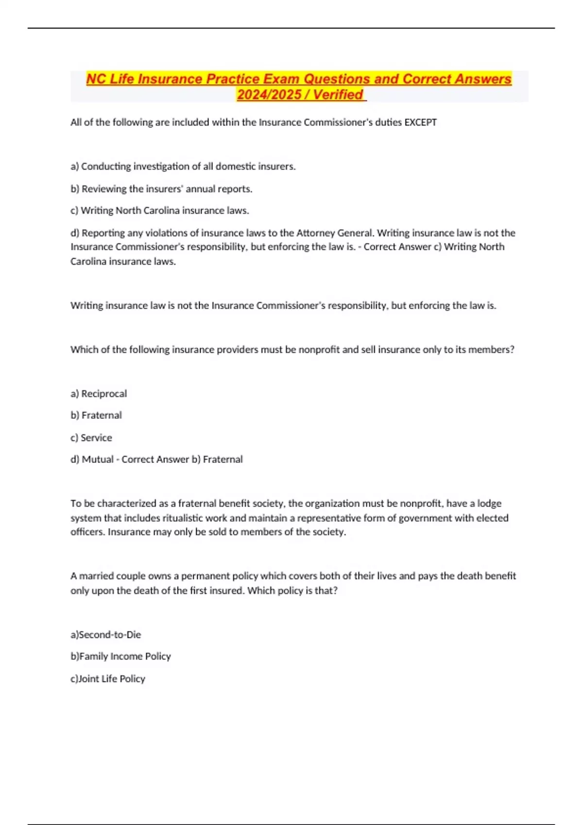 NC Life Insurance Practice Exam Questions and Correct Answers 2024/2025 / Verified All of the following are included within the Insurance Commissioner's duties EXCEPT a) Conducting investigation of all domestic insurers. b) Reviewing the insurers' annual reports. c) Writing North Carolina insurance laws. d) Reporting any violations of insurance laws to the Attorney General. Writing insurance law is not the Insurance Commissioner's responsibility, but enforcing the law is. - Correct Answer c) Writing North Carolina insurance laws. Writing insurance law is not the Insurance Commissioner's responsibility, but enforcing the law is. Which of the following insurance providers must be nonprofit and sell insurance only to its members? a) Reciprocal b) Fraternal c) Service d) Mutual - Correct Answer b) Fraternal To be characterized as a fraternal benefit society, the organization must be nonprofit, have a lodge system that includes ritualistic work and maintain a representative form of government with elected officers. Insurance may only be sold to members of the society. A married couple owns a permanent policy which covers both of their lives and pays the death benefit only upon the death of the first insured. Which policy is that? a)Second-to-Die b)Family Income Policy c)Joint Life Policy d)Survivorship Life Policy - Correct Answer c)Joi