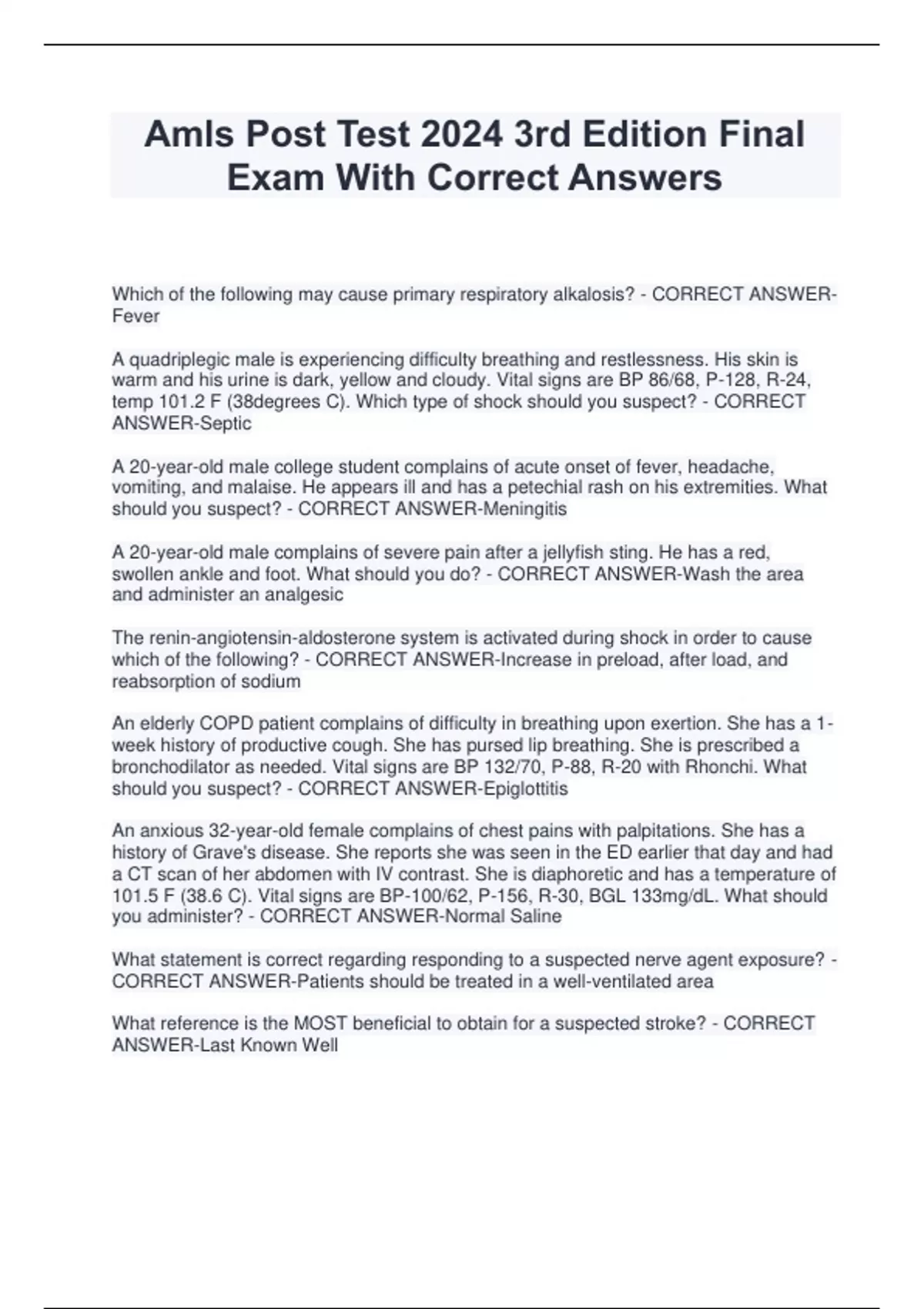 Amls Post Test 2024 3rd Edition Final Exam With Correct Answers Which of the following may cause primary respiratory alkalosis? - CORRECT ANSWERFever A quadriplegic male is experiencing difficulty breathing and restlessness. His skin is warm and his urine is dark, yellow and cloudy. Vital signs are BP 86/68, P-128, R-24, temp 101.2 F (38degrees C). Which type of shock should you suspect? - CORRECT ANSWER-Septic A 20-year-old male college student complains of acute onset of fever, headache, vomiting, and malaise. He appears ill and has a petechial rash on his extremities. What should you suspect? - CORRECT ANSWER-Meningitis A 20-year-old male complains of severe pain after a jellyfish sting. He has a red, swollen ankle and foot. What should you do? - CORRECT ANSWER-Wash the area and administer an analgesic The renin-angiotensin-aldosterone system is activated during shock in order to cause which of the following? - CORRECT ANSWER-Increase in preload, after load, and reabsorption of sodium An elderly COPD patient complains of difficulty in breathing upon exertion. She has a 1- week history of productive cough. She has pursed lip breathing. She is prescribed a bronchodilator as needed. Vital signs are BP 132/70, P-88, R-20 with Rhonchi. What should you suspect? - CORRECT ANSWER-Epiglottitis An anxious 32-year-old female complains of chest pains with palpitations. She has a history of Grave's disease. She reports she was seen in the ED earlier that day and had a CT scan of her abdomen with IV contrast. She is diaphoretic and has a temperature of 101.5 F (38.6 C). Vital signs are BP-100/62, P-156, R-30, BGL 133mg/dL. What should you administer? - CORRECT ANSWER-Normal Saline What statement is correct regarding responding to a suspected nerve agent exposure? - CORRECT ANSWER-Patients should be treated in a well-ventilated area What reference is the MOST beneficial to obtain for a suspected stroke? - CORRECT ANSWER-Last Known Well Which of the following statements is corre