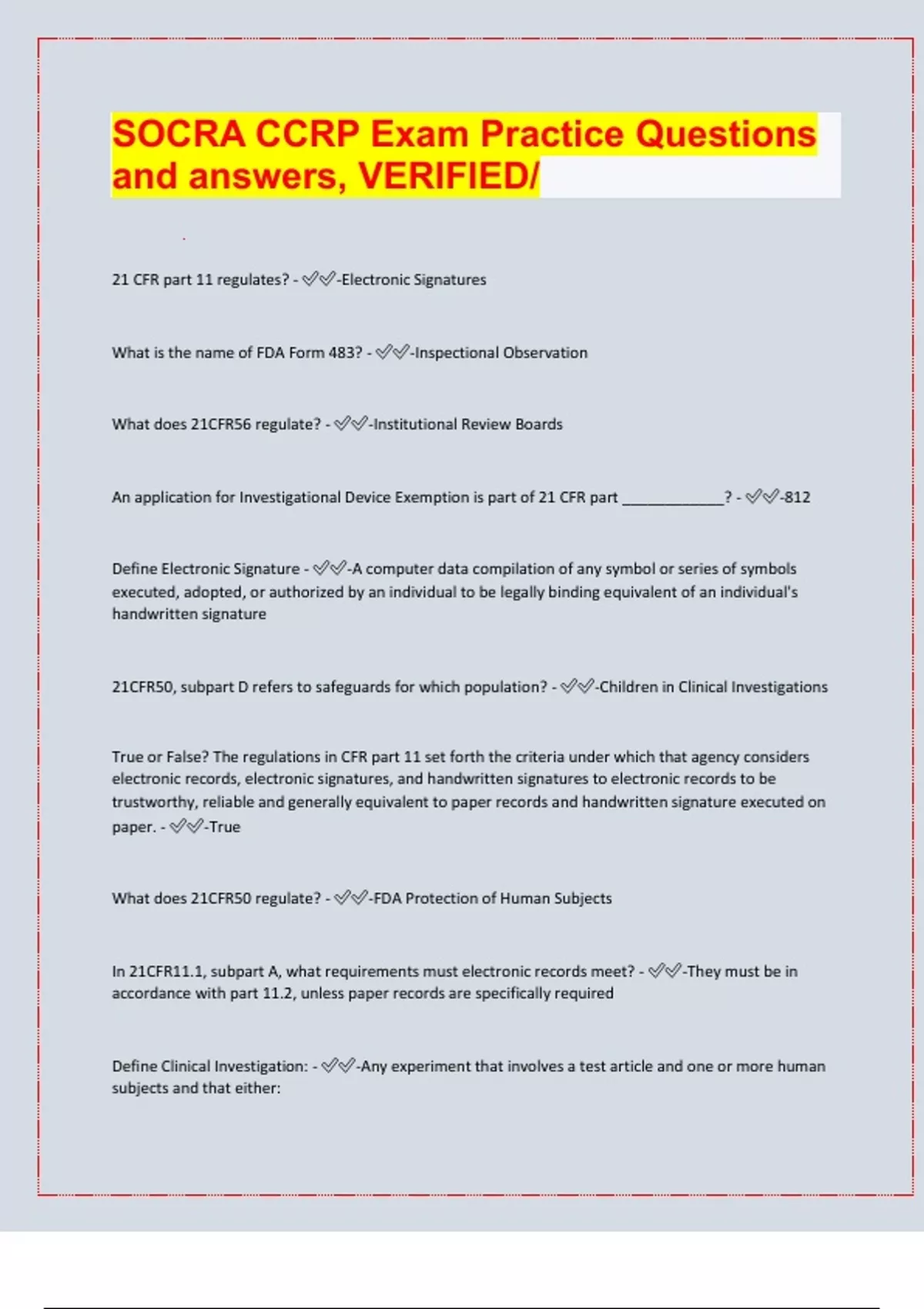 SOCRA CCRP Exam Practice Questions and answers, VERIFIED/ 21 CFR part 11 regulates? - -Electronic Signatures What is the name of FDA Form 483? - -Inspectional Observation What does 21CFR56 regulate? - -Institutional Review Boards An application for Investigational Device Exemption is part of 21 CFR part ____________? - -812 Define Electronic Signature - -A computer data compilation of any symbol or series of symbols executed, adopted, or authorized by an individual to be legally binding equivalent of an individual's handwritten signature 21CFR50, subpart D refers to safeguards for which population? - -Children in Clinical Investigations True or False? The regulations in CFR part 11 set forth the criteria under which that agency considers electronic records, electronic signatures, and handwritten signatures to electronic records to be trustworthy, reliable and generally equivalent to paper records and handwritten signature executed on paper. - -True What does 21CFR50 regulate? - -FDA Protection of Human Subjects In 21CFR11.1, subpart A, what requirements must electronic records meet? - -They must be in accordance with part 11.2, unless paper records are specifically required Define Clinical Investigation: - -Any experiment that involves a test article and one or more human subjects and that either: - Is subject to requirements for prior submission to the FDA under section 505(i) or 520(g) - Or is not subject to requirements for prior submission but the results of which are intended to be later submitted - Or held by inspection by the FDA as a part of an application for a research or marketing permit True or False? 21CFR11.2, subpart A is only for electronic records required to be maintained that must be submitted to an agency. - -False. CFR part 11.2, subpart A is for electronic records maintenance when submitting to an agency and also when not submitting to an agency.