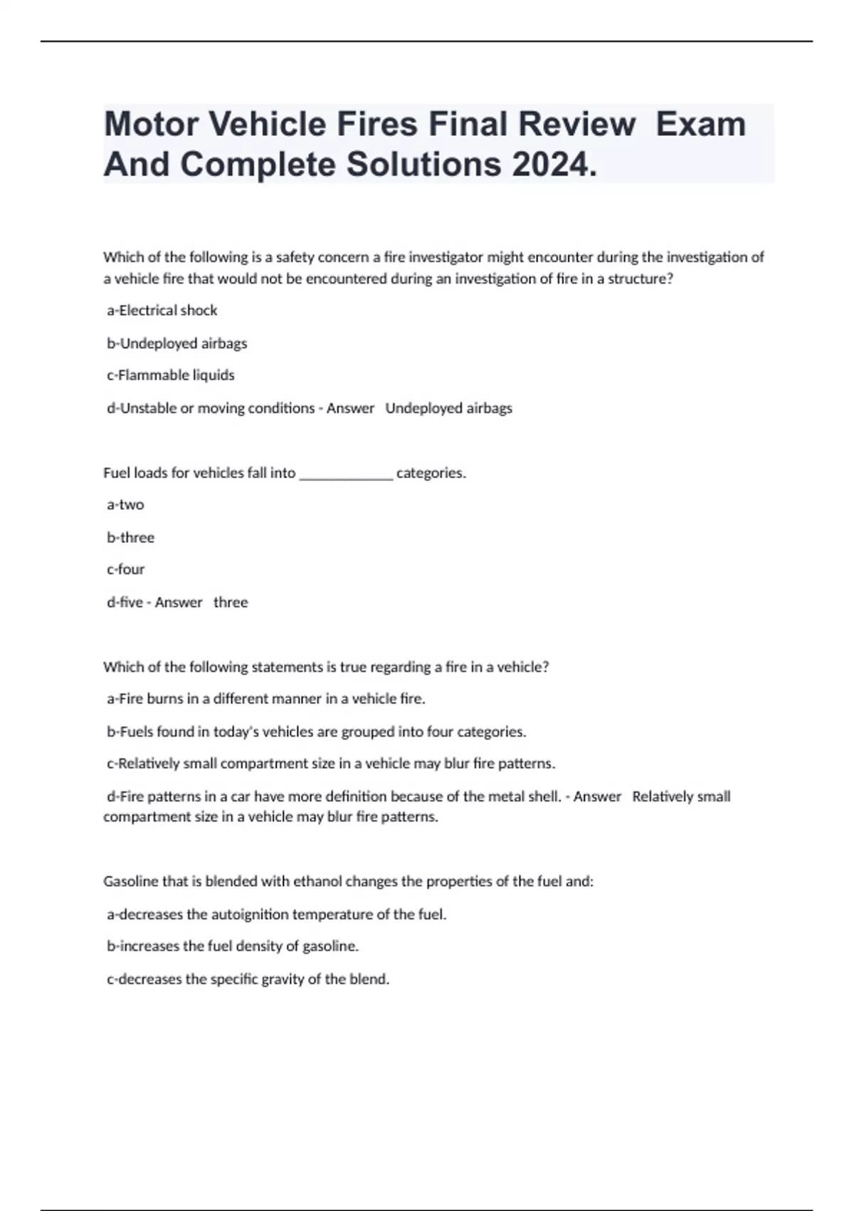 Which of the following is a safety concern a fire investigator might encounter during the investigation of a vehicle fire that would not be encountered during an investigation of fire in a structure? a-Electrical shock b-Undeployed airbags c-Flammable liquids d-Unstable or moving conditions - Answer Undeployed airbags Fuel loads for vehicles fall into ____________ categories. a-two b-three c-four d-five - Answer three Which of the following statements is true regarding a fire in a vehicle? a-Fire burns in a different manner in a vehicle fire. b-Fuels found in today's vehicles are grouped into four categories. c-Relatively small compartment size in a vehicle may blur fire patterns. d-Fire patterns in a car have more definition because of the metal shell. - Answer Relatively small compartment size in a vehicle may blur fire patterns. Gasoline that is blended with ethanol changes the properties of the fuel and: a-decreases the autoignition temperature of the fuel. b-increases the fuel density of gasoline. c-decreases the specific gravity of the blend.
