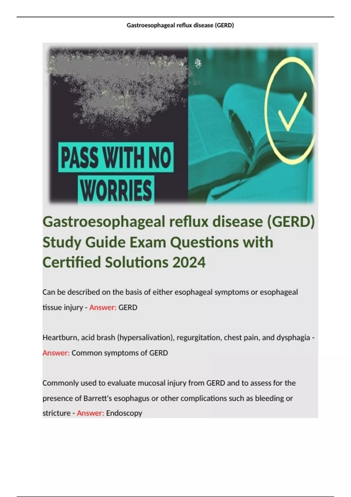 Gastroesophageal reflux disease (GERD) Study Guide Exam Questions with Certified Solutions 2024