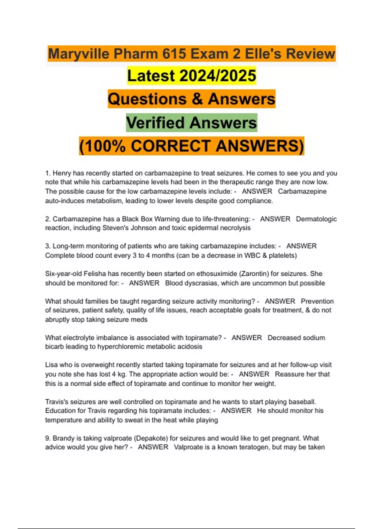 1. Henry has recently started on carbamazepine to treat seizures. He comes to see you and you note that while his carbamazepine levels had been in the therapeutic range they are now low. The possible cause for the low carbamazepine levels include: - ANSWER Carbamazepine auto-induces metabolism, leading to lower levels despite good compliance. 2. Carbamazepine has a Black Box Warning due to life-threatening: - ANSWER Dermatologic reaction, including Steven's Johnson and toxic epidermal necrolysis 3. Long-term monitoring of patients who are taking carbamazepine includes: - ANSWER Complete blood count every 3 to 4 months (can be a decrease in WBC & platelets) Six-year-old Felisha has recently been started on ethosuximide (Zarontin) for seizures. She should be monitored for: - ANSWER Blood dyscrasias, which are uncommon but possible What should families be taught regarding seizure activity monitoring? - ANSWER Prevention of seizures, patient safety, quality of life issues, reach acceptable goals for treatment, & do not abruptly stop taking seizure meds What electrolyte imbalance is associated with topiramate? - ANSWER Decreased sodium bicarb leading to hyperchloremic metabolic acidosis Lisa who is overweight recently started taking topiramate for seizures and at her follow-up visit you note she has lost 4 kg. The appropriate action would be: - ANSWER Reassure her that this is a normal side effect of topiramate and continue to monitor her weight. Travis's seizures are well controlled on topiramate and he wants to start playing baseball. Education for Travis regarding his topiramate includes: - ANSWER He should monitor his temperature and ability to sweat in the heat while playing 9. Brandy is taking valproate (Depakote) for seizures and would like to get pregnant. What advice would you give her? - ANSWER Valproate is a known teratogen, but may be taken after the first trimester if necessary. Keppra is a better drug to be on until the second trimester, then she can go back to valproate. 10. What category is valproate? - ANSWER Category X
