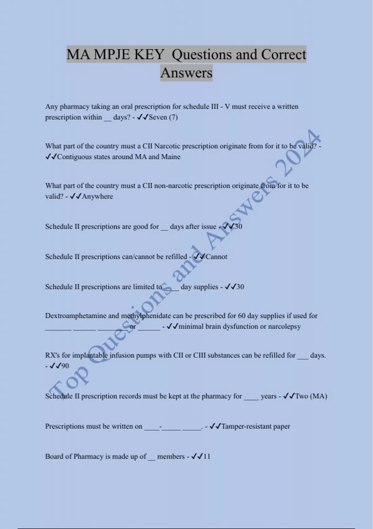 Any pharmacy taking an oral prescription for schedule III - V must receive a written prescription within __ days? - Seven (7) What part of the country must a CII Narcotic prescription originate from for it to be valid? - Contiguous states around MA and Maine What part of the country must a CII non-narcotic prescription originate from for it to be valid? - Anywhere Schedule II prescriptions are good for __ days after issue - 30 Schedule II prescriptions can/cannot be refilled - Cannot Schedule II prescriptions are limited to ____ day supplies - 30 Dextroamphetamine and methylphenidate can be prescribed for 60 day supplies if used for _______ ______ ________ or ______ - minimal brain dysfunction or narcolepsy RX's for implantable infusion pumps with CII or CIII substances can be refilled for ___ days. - 90 Schedule II prescription records must be kept at the pharmacy for ____ years - Two (MA) Prescriptions must be written on ____-_____ _____. - Tamper-resistant paper Board of Pharmacy is made up of __ members - 11 Describe the members of the Board of Pharmacy and it's required positions - - At least 5 registered pharmacist's with at least 10 years of experience. - 1 chain RPh, 1 independent RPh, 1 long-term care facility RPh, 1 non-profit hospital RPh, 1 medical doctor, 1 registered nurse, and 2 members of the public are required. - No more than two pharmacists can be from the same practice setting. - No member can be from the same senatorial district. How often are members of the Board of Pharmacy elected? - 1 member Every 5 years When is a new member of the Board of Pharmacy elected - November Who elects a new member of the Board of Pharmacy - Governor The Board of Pharmacy meets the ____ ______ of every ____ to elect a secretary and president. How long will they serve under those positions? - First tuesday of every December. 1 year The Board of Pharmacy also hold annual meetings on the ____ _______ of _______,_______, and ______. - First tuesday of January, May, and October How much does the Secretary of the Board earn a year? (2013) - $2250 plus traveling expenses to and from board meetings How much do members of the Board of Pharmacy earn a year? (2013) - $1050 plus traveling expenses to and from board meetings The Board of Pharmacy appoints __(number)___ agents who will inspect all drug establishments. These agents will also file criminal complaints on behalf of the board. - Six (6) Pharmacist Registrations expire on ______, of ___-numbered years. - December 31st of even-numbered years CDTM can only be performed in these locations - Hospitals LTCF's In- and Out-patient hospice Ambulatory Care facilities Retail Pharmacies To be eligible to participate in CDTM, a pharmacist must: - - Be currently registered - Have at least $1,000,000 in liability insurance - Have a PharmD or at least 5 years experience - Devote part of the pharmacy to a drug therapy area - Participate in 5 extra CE hours (0.5 CEUs) that address areas of practice generally related to the particular collaborative practice agreement CDTM agreement must be limited to: - - Patients 18 years or older - 30 day-extension of medication with the same directions as prescribed by the practitioner (for not more than two 30 day periods) - Administration of Vaccines - Initiations, discontinuations, or modifications of dosages for asthma, COPD, DM, HTN, hyperlipidemia, HIV/AIDS, osteoporosis, CHF, and co-morbidities for individuals accompanying the primary diagnosis True or False? A patient must be given notice of CDTM - True True or False? A patient must sign a consent form before participating in CDTM? - True True or False? A pharmacist must receive a referral before performing CDTM? - True True or False? A pharmacist may prescribe schedule III - V medications if allowed under a collaborative practice agreement? - False. A pharmacist may only prescribe schedule VI medications under a collaborative practice agreement, if allowed by the physician