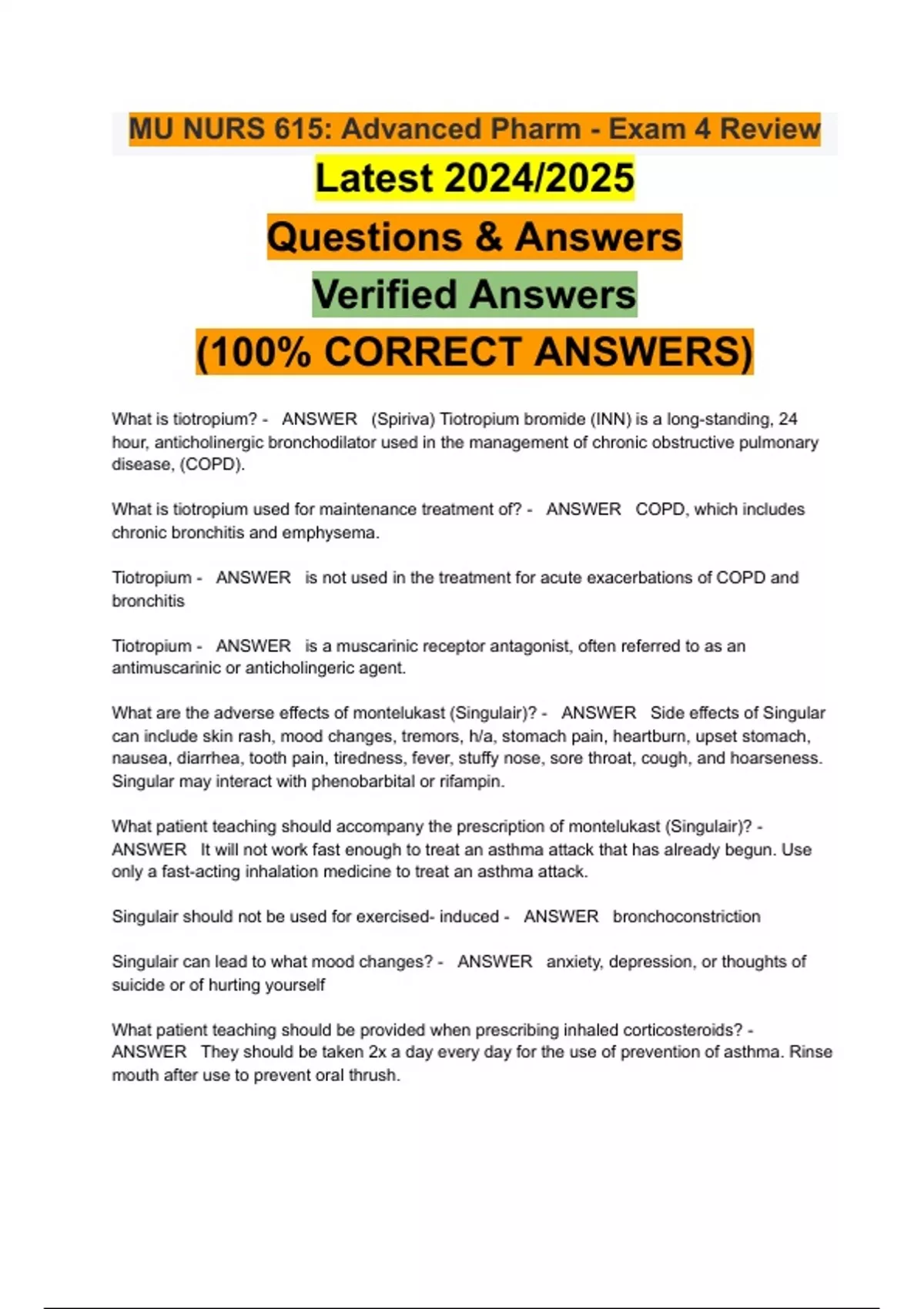 What is tiotropium? - ANSWER (Spiriva) Tiotropium bromide (INN) is a long-standing, 24 hour, anticholinergic bronchodilator used in the management of chronic obstructive pulmonary disease, (COPD). What is tiotropium used for maintenance treatment of? - ANSWER COPD, which includes chronic bronchitis and emphysema. Tiotropium - ANSWER is not used in the treatment for acute exacerbations of COPD and bronchitis Tiotropium - ANSWER is a muscarinic receptor antagonist, often referred to as an antimuscarinic or anticholingeric agent. What are the adverse effects of montelukast (Singulair)? - ANSWER Side effects of Singular can include skin rash, mood changes, tremors, h/a, stomach pain, heartburn, upset stomach, nausea, diarrhea, tooth pain, tiredness, fever, stuffy nose, sore throat, cough, and hoarseness. Singular may interact with phenobarbital or rifampin. What patient teaching should accompany the prescription of montelukast (Singulair)? - ANSWER It will not work fast enough to treat an asthma attack that has already begun. Use only a fast-acting inhalation medicine to treat an asthma attack. Singulair should not be used for exercised- induced - ANSWER bronchoconstriction Singulair can lead to what mood changes? - ANSWER anxiety, depression, or thoughts of suicide or of hurting yourself What patient teaching should be provided when prescribing inhaled corticosteroids? - ANSWER They should be taken 2x a day every day for the use of prevention of asthma. Rinse mouth after use to prevent oral thrush.