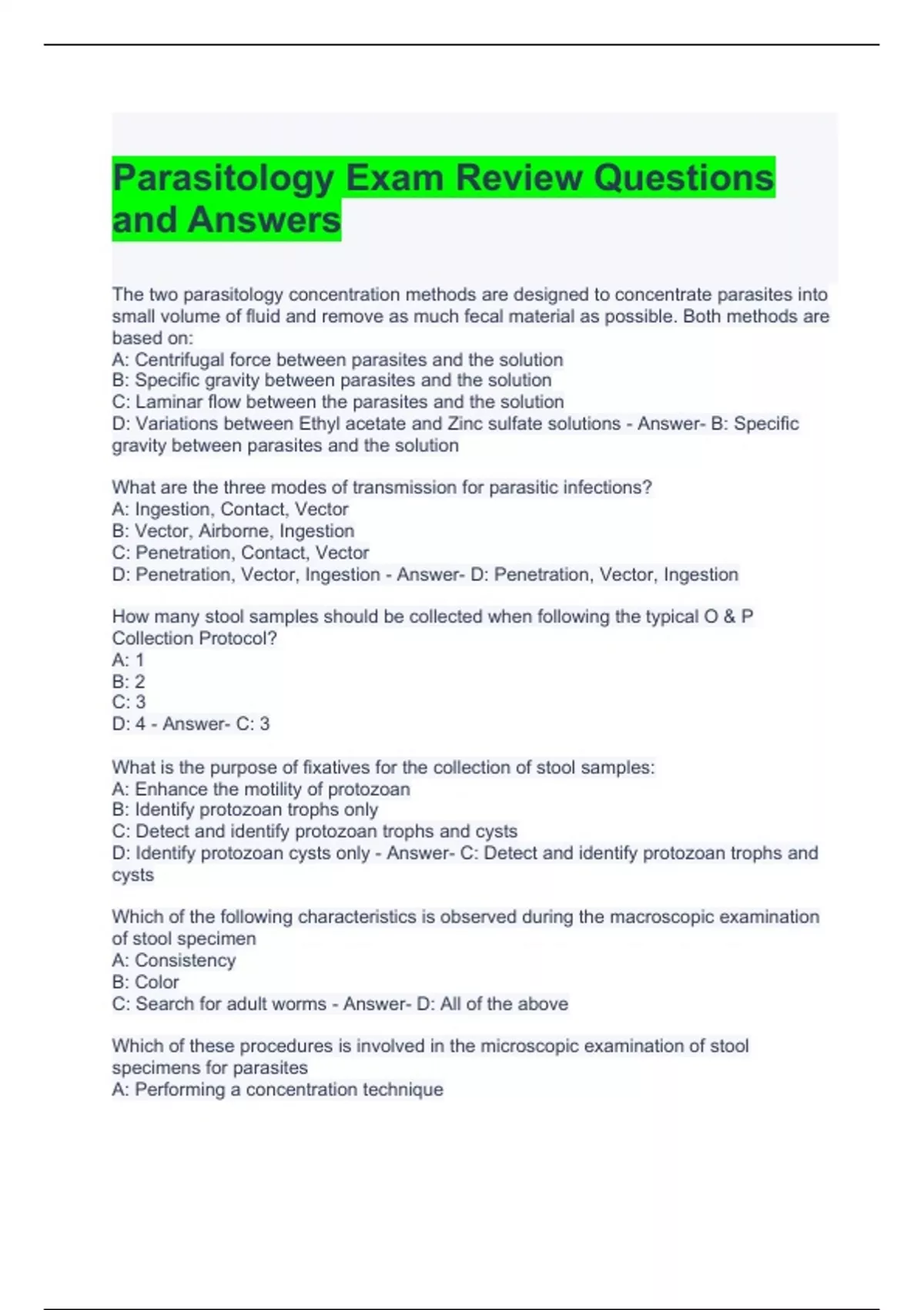 Parasitology Exam Review Questions and Answers