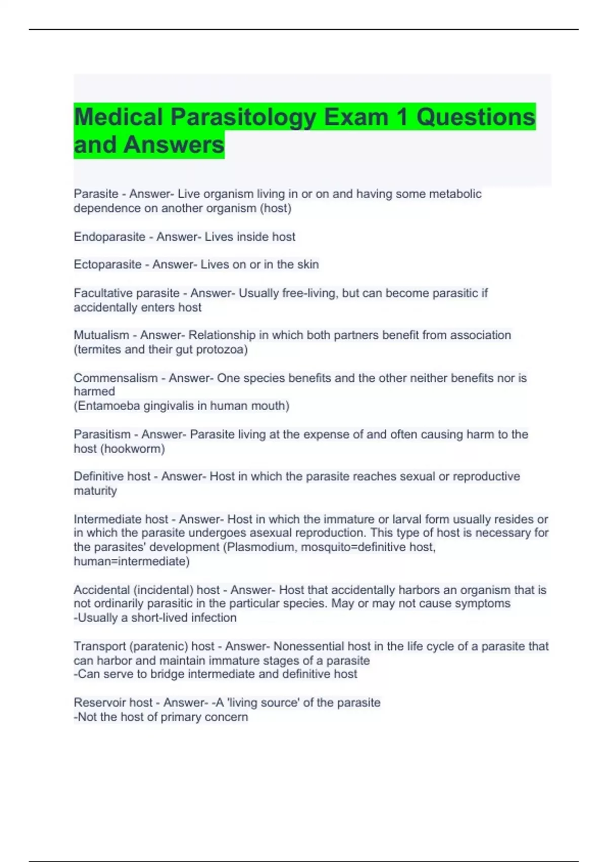 Medical Parasitology Exam 1 Questions and Answers- Graded A