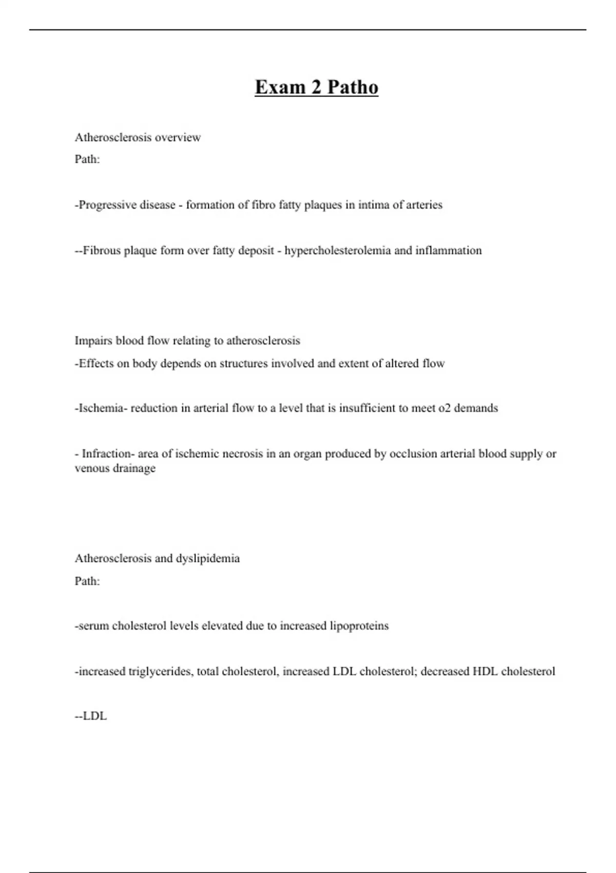 Atherosclerosis overview Path: -Progressive disease - formation of fibro fatty plaques in intima of arteries --Fibrous plaque form over fatty deposit - hypercholesterolemia and inflammation Impairs blood flow relating to atherosclerosis -Effects on body depends on structures involved and extent of altered flow -Ischemia- reduction in arterial flow to a level that is insufficient to meet o2 demands - Infraction- area of ischemic necrosis in an organ produced by occlusion arterial blood supply or venous drainage Atherosclerosis and dyslipidemia Path: -serum cholesterol levels elevated due to increased lipoproteins -increased triglycerides, total cholesterol, increased LDL cholesterol; decreased HDL cholesterol --LDL --HDL LDL -low-density lipoprotein --carry cholesterol; l="lousy' HDL -high-density lipoprotein --carry protein; h="healthy" Non-modifiable risk factors of atherosclerosis -increasing age -male gender -post-menopausal women -genetic disorders of lipid metabolism Modifiable risk factors of atherosclerosis -high cholesterol levels -smoking -obesity -hypertension (HTN) -diabetes Path: process of atherosclerosis -injury of endothelium and tunica intima (inflammatory process) by risk factors -foam cells --LDL cholesterol invades tunica intima layer; macrophages "eat up" LDL & dia; accumulate and build fatty layers (streaks) -plague structure --smooth muscle cells of tunica media form fibrous cap of collagen & elastin over fatty streaks and lay down calcium deposits --plaque build-up is a repetitive process -artery lumen narrows --decreases blood flow (less o2 to tissue)