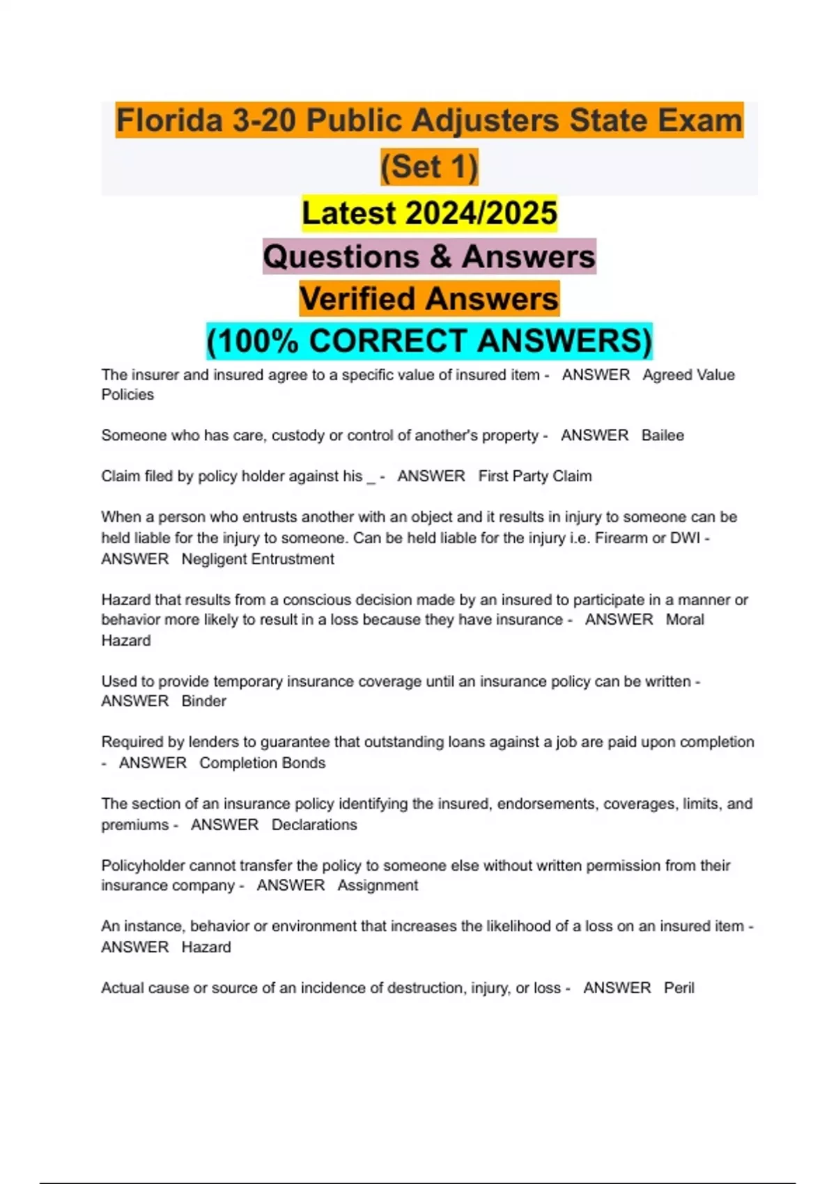 (100% CORRECT ANSWERS) The insurer and insured agree to a specific value of insured item - ANSWER Agreed Value Policies Someone who has care, custody or control of another's property - ANSWER Bailee Claim filed by policy holder against his _ - ANSWER First Party Claim When a person who entrusts another with an object and it results in injury to someone can be held liable for the injury to someone. Can be held liable for the injury i.e. Firearm or DWI - ANSWER Negligent Entrustment Hazard that results from a conscious decision made by an insured to participate in a manner or behavior more likely to result in a loss because they have insurance - ANSWER Moral Hazard