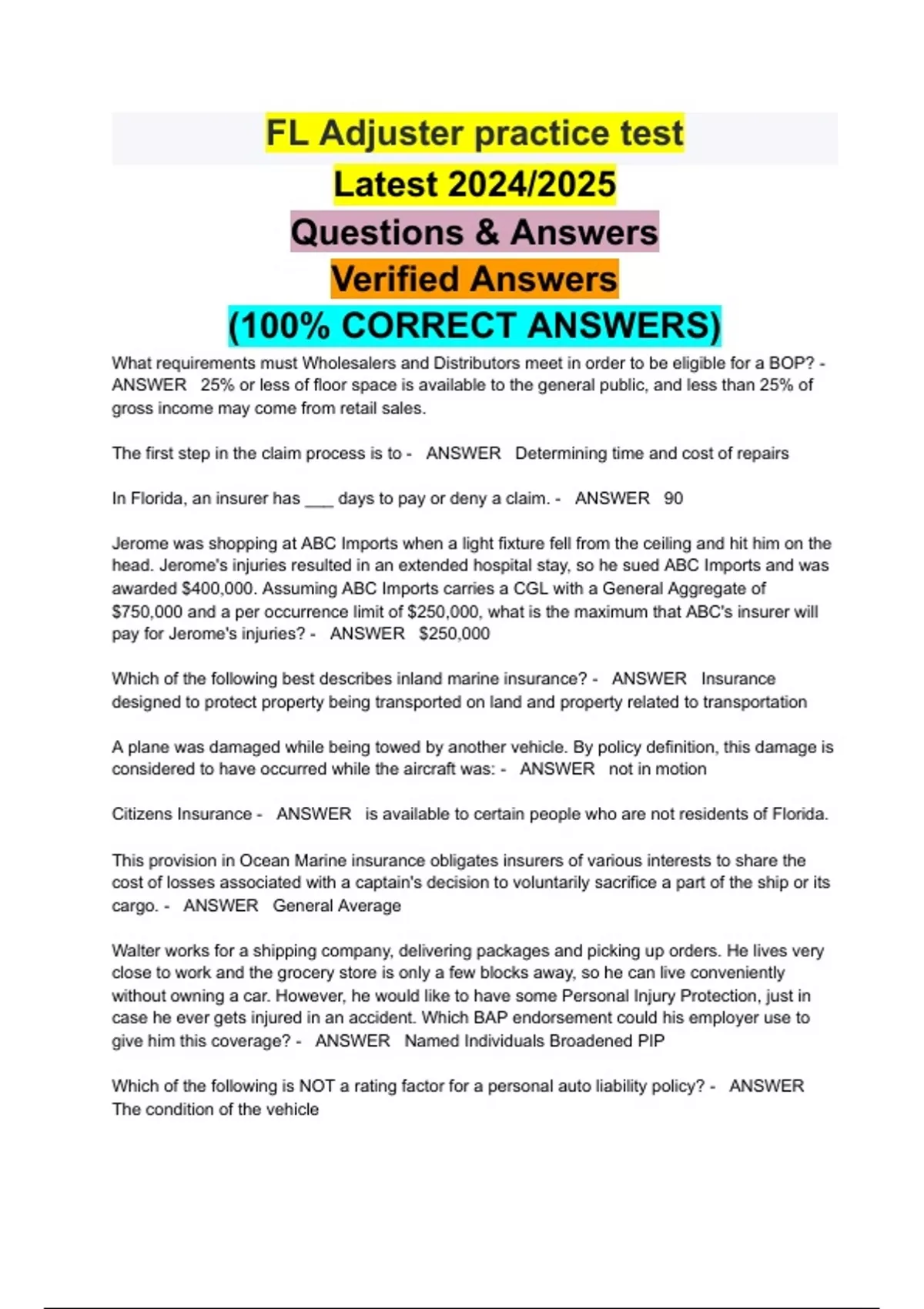 FL Adjuster practice test Latest 2024/2025 Questions & Answers Verified Answers (100% CORRECT ANSWERS