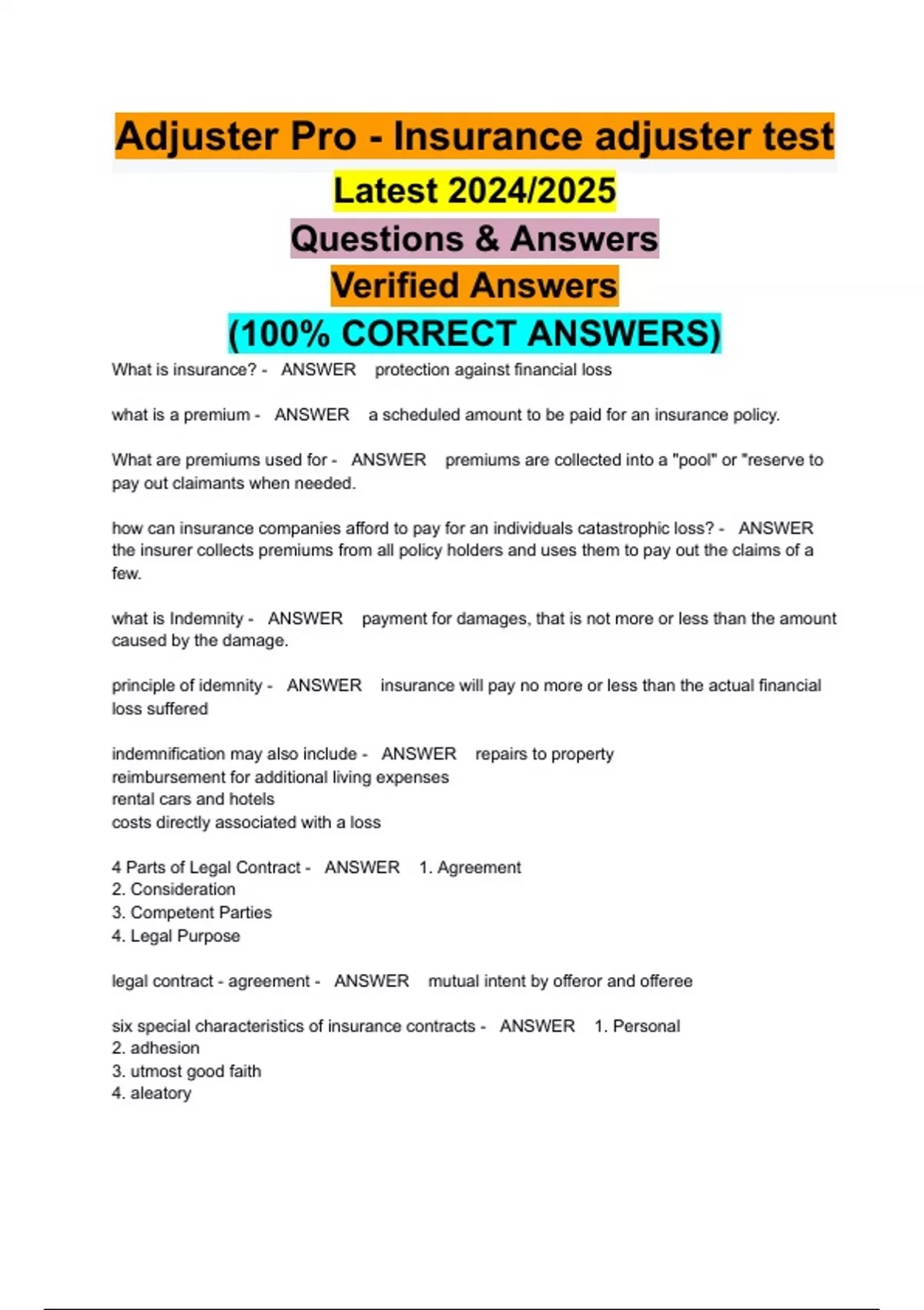 Adjuster Pro - Insurance adjuster test Latest 2024/2025 Questions & Answers Verified Answers (100% CORRECT ANSWERS)