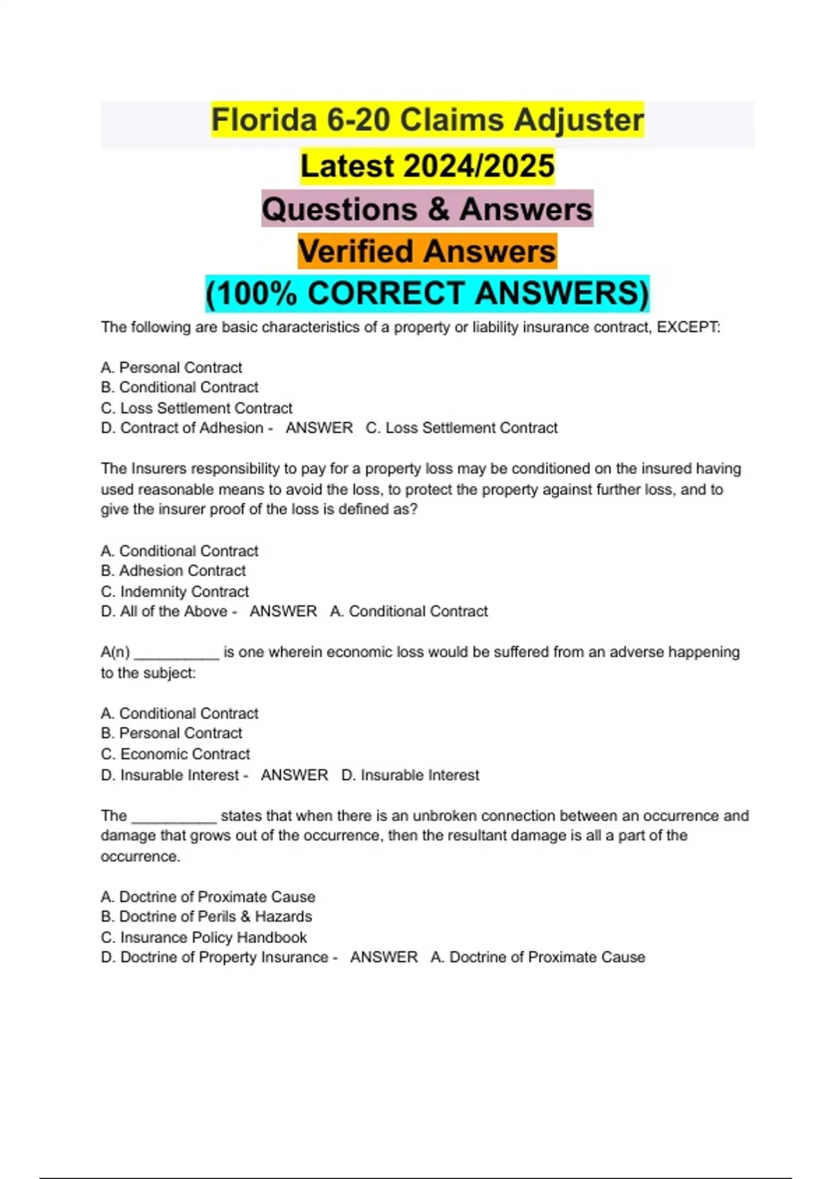 Florida 6-20 Claims Adjuster Latest 2024/2025 Questions & Answers Verified Answers (100% CORRECT ANSWERS)