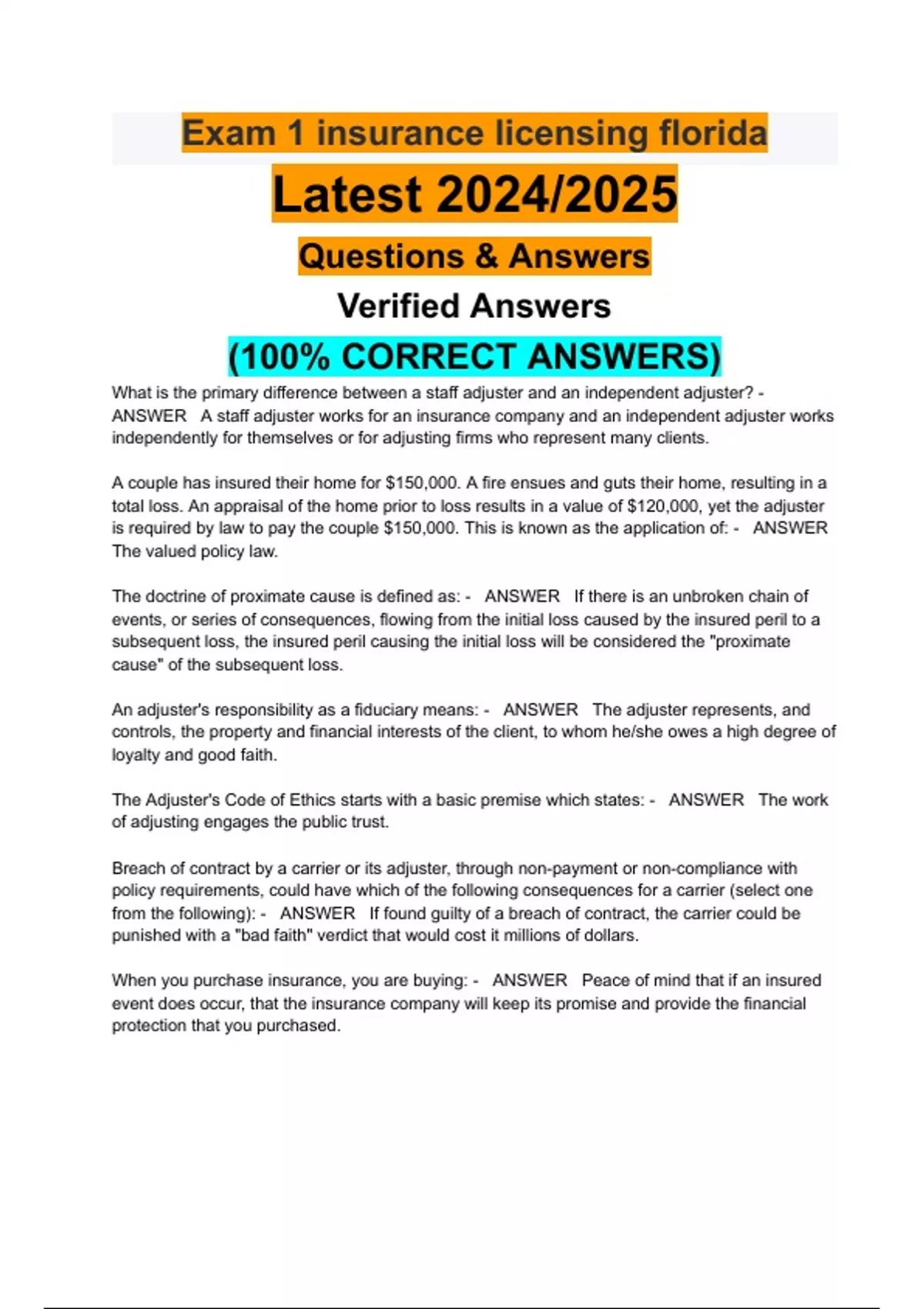 What is the primary difference between a staff adjuster and an independent adjuster? - ANSWER A staff adjuster works for an insurance company and an independent adjuster works independently for themselves or for adjusting firms who represent many clients. A couple has insured their home for $150,000. A fire ensues and guts their home, resulting in a total loss. An appraisal of the home prior to loss results in a value of $120,000, yet the adjuster is required by law to pay the couple $150,000. This is known as the application of: - ANSWER The valued policy law. The doctrine of proximate cause is defined as: - ANSWER If there is an unbroken chain of events, or series of consequences, flowing from the initial loss caused by the insured peril to a subsequent loss, the insured peril causing the initial loss will be considered the "proximate cause" of the subsequent loss. An adjuster's responsibility as a fiduciary means: - ANSWER The adjuster represents, and controls, the property and financial interests of the client, to whom he/she owes a high degree of loyalty and good faith. The Adjuster's Code of Ethics starts with a basic premise which states: - ANSWER The work of adjusting engages the public trust