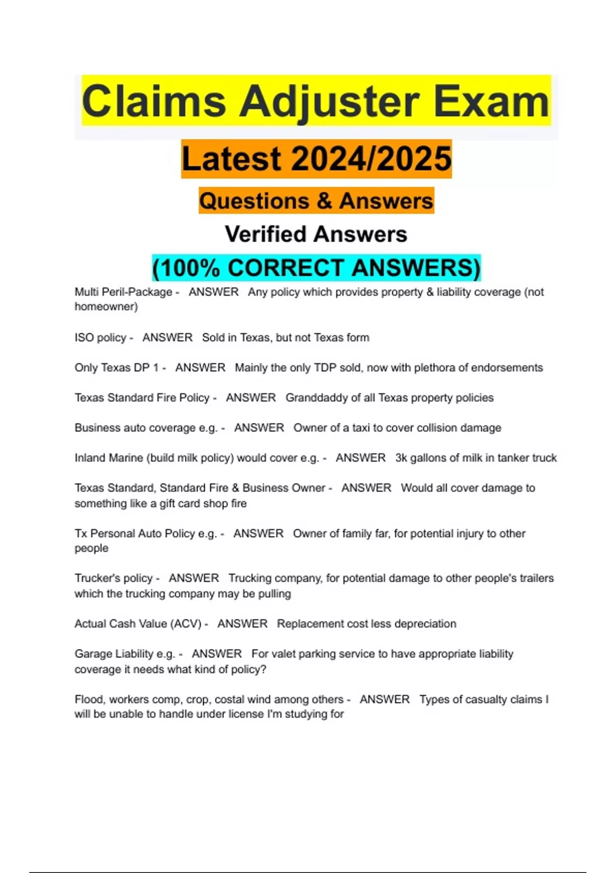 Claims Adjuster Exam Latest 2024/2025 Questions & Answers Verified Answers (100% CORRECT ANSWERS)