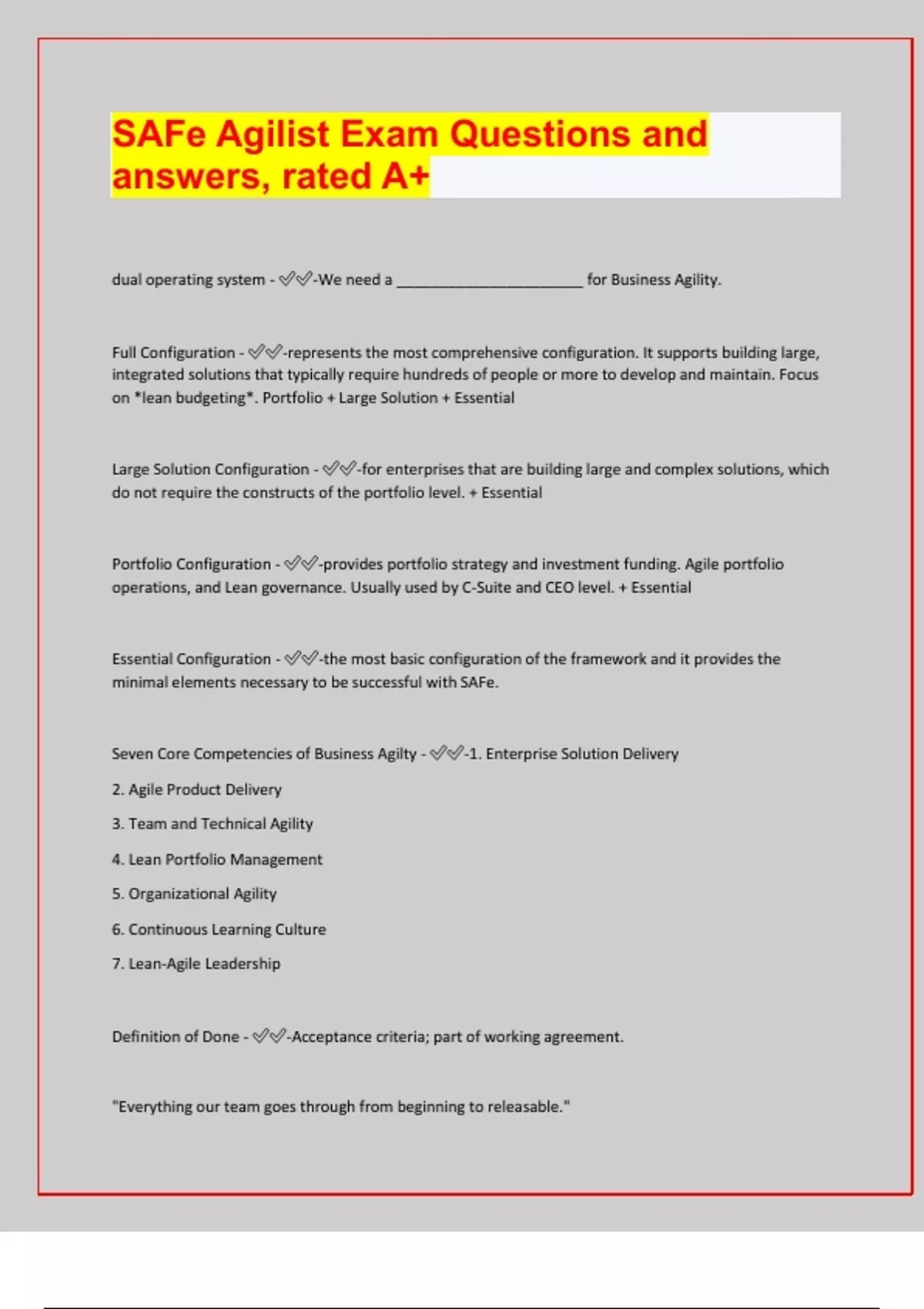 SAFe Agilist Exam Questions and answers, rated A+ dual operating system - -We need a ______________________ for Business Agility. Full Configuration - -represents the most comprehensive configuration. It supports building large, integrated solutions that typically require hundreds of people or more to develop and maintain. Focus on *lean budgeting*. Portfolio + Large Solution + Essential Large Solution Configuration - -for enterprises that are building large and complex solutions, which do not require the constructs of the portfolio level. + Essential Portfolio Configuration - -provides portfolio strategy and investment funding. Agile portfolio operations, and Lean governance. Usually used by C-Suite and CEO level. + Essential Essential Configuration - -the most basic configuration of the framework and it provides the minimal elements necessary to be successful with SAFe. Seven Core Competencies of Business Agilty - -1. Enterprise Solution Delivery 2. Agile Product Delivery 3. Team and Technical Agility 4. Lean Portfolio Management 5. Organizational Agility 6. Continuous Learning Culture 7. Lean-Agile Leadership Definition of Done - -Acceptance criteria; part of working agreement. "Everything our team goes through from beginning to releasable." Three Aspects of Team and Technical Agility - -1. Agile Teams 2. Built-In Quality 3. Teams of Agile Team