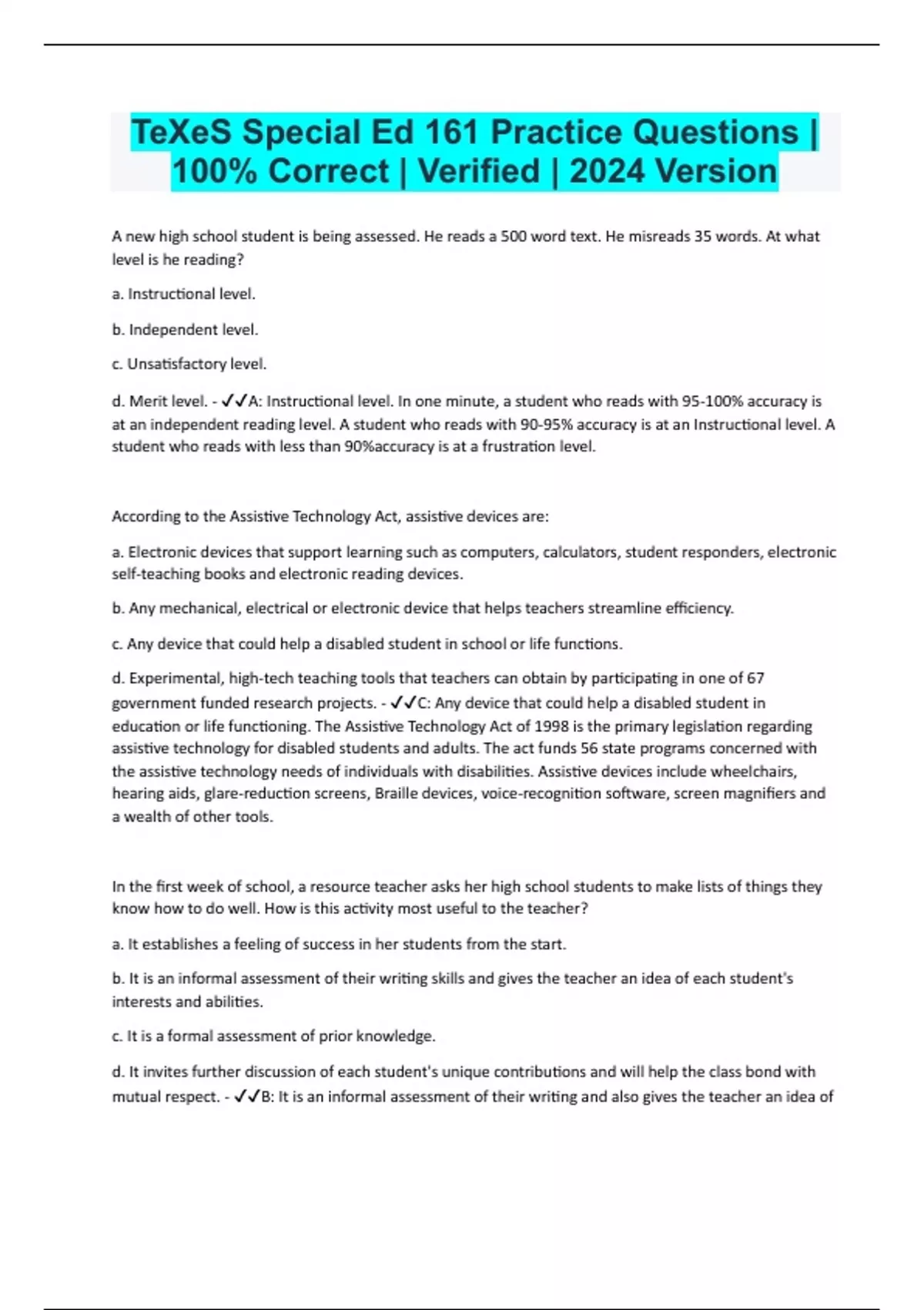 A new high school student is being assessed. He reads a 500 word text. He misreads 35 words. At what level is he reading? a. Instructional level. b. Independent level. c. Unsatisfactory level. d. Merit level. - A: Instructional level. In one minute, a student who reads with 95-100% accuracy is at an independent reading level. A student who reads with 90-95% accuracy is at an Instructional level. A student who reads with less than 90%accuracy is at a frustration level. According to the Assistive Technology Act, assistive devices are: a. Electronic devices that support learning such as computers, calculators, student responders, electronic self-teaching books and electronic reading devices. b. Any mechanical, electrical or electronic device that helps teachers streamline efficiency. c. Any device that could help a disabled student in school or life functions. d. Experimental, high-tech teaching tools that teachers can obtain by participating in one of 67 government funded research projects. - C: Any device that could help a disabled student in education or life functioning. The Assistive Technology Act of 1998 is the primary legislation regarding assistive technology for disabled students and adults. The act funds 56 state programs concerned with the assistive technology needs of individuals with disabilities. Assistive devices include wheelchairs, hearing aids, glare-reduction screens, Braille devices, voice-recognition software, screen magnifiers and a wealth of other tools. In the first week of school, a resource teacher asks her high school students to make lists of things they know how to do well. How is this activity most useful to the teacher? a. It establishes a feeling of success in her students from the start. b. It is an informal assessment of their writing skills and gives the teacher an idea of each student's interests and abilities. c. It is a formal assessment of prior knowledge. d. It invites further discussion of each student's unique contributions and will help the class bond with mutual respect.