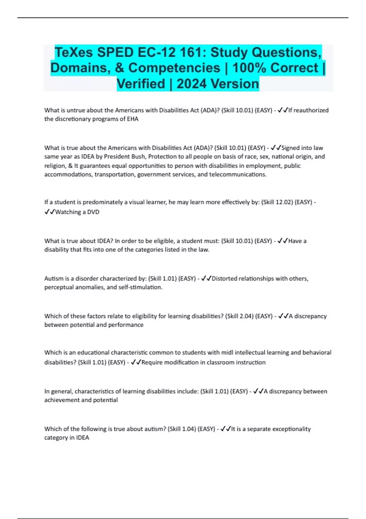 What is untrue about the Americans with Disabilities Act (ADA)? (Skill 10.01) (EASY) - If reauthorized the discretionary programs of EHA What is true about the Americans with Disabilities Act (ADA)? (Skill 10.01) (EASY) - Signed into law same year as IDEA by President Bush, Protection to all people on basis of race, sex, national origin, and religion, & It guarantees equal opportunities to person with disabilities in employment, public accommodations, transportation, government services, and telecommunications. If a student is predominately a visual learner, he may learn more effectively by: (Skill 12.02) (EASY) - Watching a DVD What is true about IDEA? In order to be eligible, a student must: (Skill 10.01) (EASY) - Have a disability that fits into one of the categories listed in the law. Autism is a disorder characterized by: (Skill 1.01) (EASY) - Distorted relationships with others, perceptual anomalies, and self-stimulation. Which of these factors relate to eligibility for learning disabilities? (Skill 2.04) (EASY) - A discrepancy between potential and performance Which is an educational characteristic common to students with midl intellectual learning and behavioral disabilities? (Skill 1.01) (EASY) - Require modification in classroom instruction