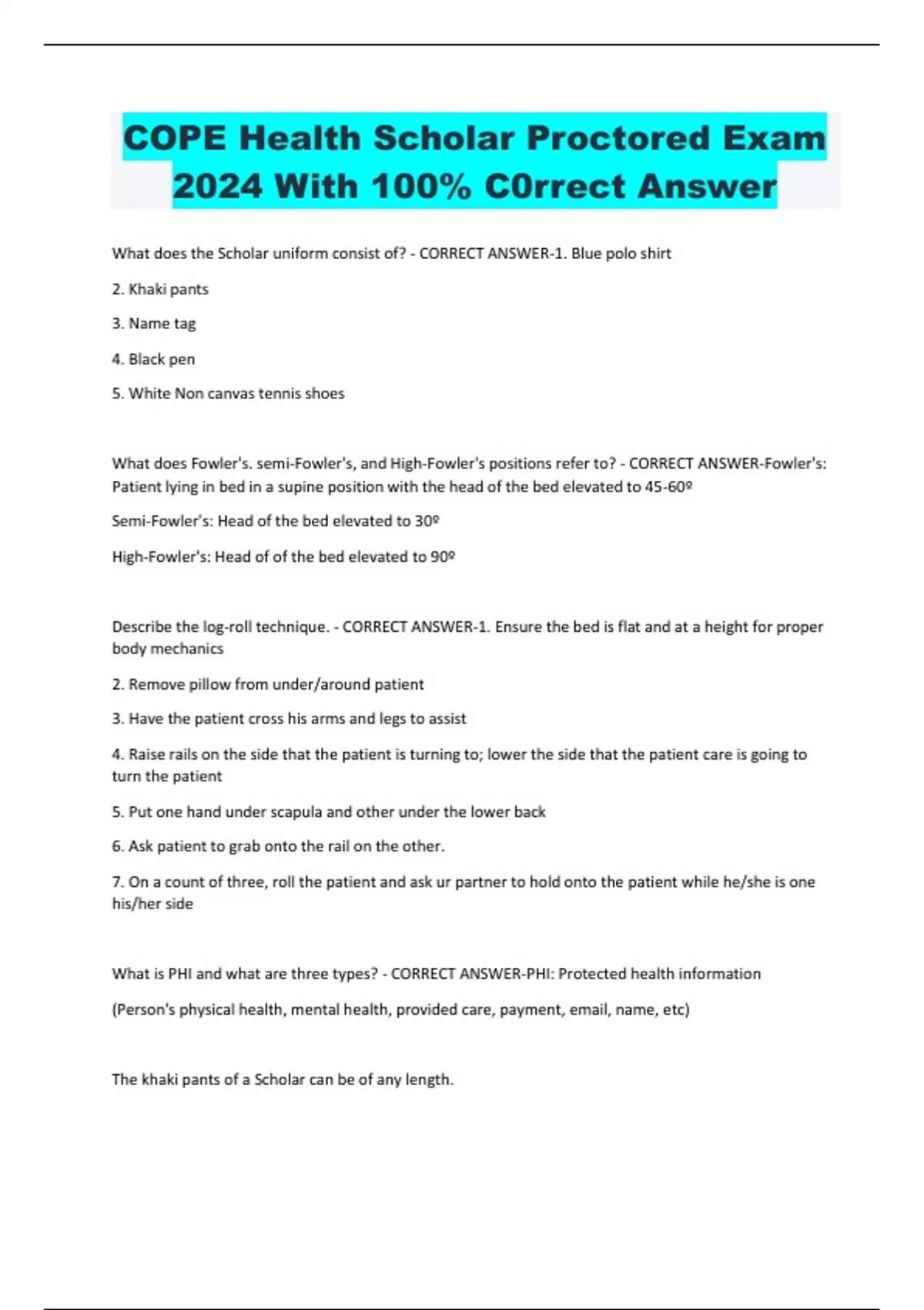 COPE Health Scholar Proctored Exam 2024 With 100% C0rrect Answer What does the Scholar uniform consist of? - CORRECT ANSWER-1. Blue polo shirt 2. Khaki pants 3. Name tag 4. Black pen 5. White Non canvas tennis shoes What does Fowler's. semi-Fowler's, and High-Fowler's positions refer to? - CORRECT ANSWER-Fowler's: Patient lying in bed in a supine position with the head of the bed elevated to 45-60º Semi-Fowler's: Head of the bed elevated to 30º High-Fowler's: Head of of the bed elevated to 90º