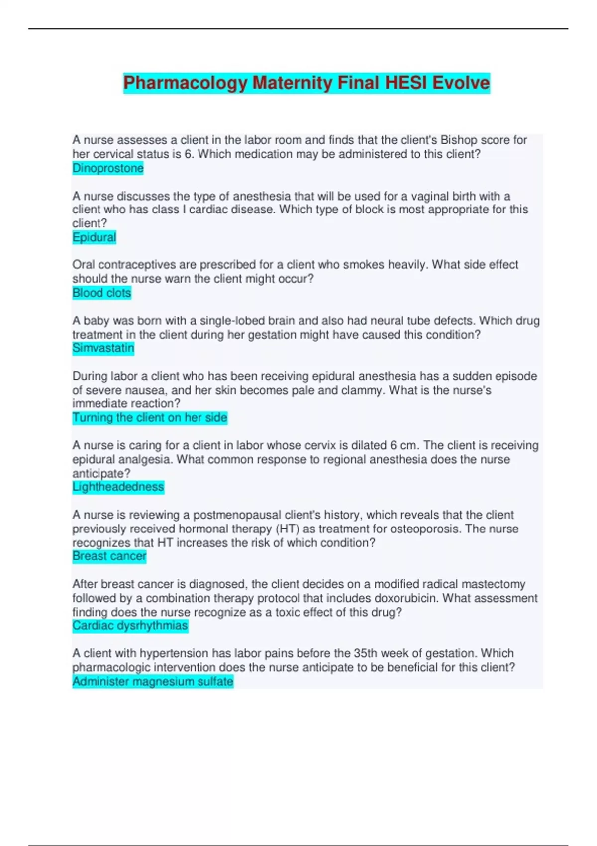 Pharmacology Maternity Final HESI (Evolve) - Questions and Answers A nurse assesses a client in the labor room and finds that the client's Bishop score for her cervical status is 6. Which medication may be administered to this client? Dinoprostone A nurse discusses the type of anesthesia that will be used for a vaginal birth with a client who has class I cardiac disease. Which type of block is most appropriate for this client? Epidural Oral contraceptives are prescribed for a client who smokes heavily. What side effect should the nurse warn the client might occur? Blood clots A baby was born with a single-lobed brain and also had neural tube defects. Which drug treatment in the client during her gestation might have caused this condition? Simvastatin During labor a client who has been receiving epidural anesthesia has a sudden episode of severe nausea, and her skin becomes pale and clammy. What is the nurse's immediate reaction? Turning the client on her side A nurse is caring for a client in labor whose cervix is dilated 6 cm. The client is receiving epidural analgesia. What common response to regional anesthesia does the nurse anticipate? Lightheadedness A nurse is reviewing a postmenopausal client's history, which reveals that the client previously received hormonal therapy (HT) as treatment for osteoporosis. The nurse recognizes that HT increases the risk of which condition? Breast cancer After breast cancer is diagnosed, the client decides on a modified radical mastectomy followed by a combination therapy protocol that includes doxorubicin. What assessment finding does the nurse recognize as a toxic effect of this drug? Cardiac dysrhythmias A client with hypertension has labor pains before the 35th week of gestation. Which pharmacologic intervention does the nurse anticipate to be beneficial for this client? Administer magnesium sulfate A lactating woman takes fluoxetine to treat depression. Her newborn developed tremors, seizures, and fever. Which drug-induced physiologic alterations may be responsible for the central nervous system effects of the drug on the neonate? Immature blood-brain barrier A pregnant client has labor pains. However, the nurse finds that the client's cervix is not dilated. Which drug should be administered to the client to promote labor? Dinoprostone Which drug should be excluded from the prescription of a lactating mother being treated for heart problems? Tenormin