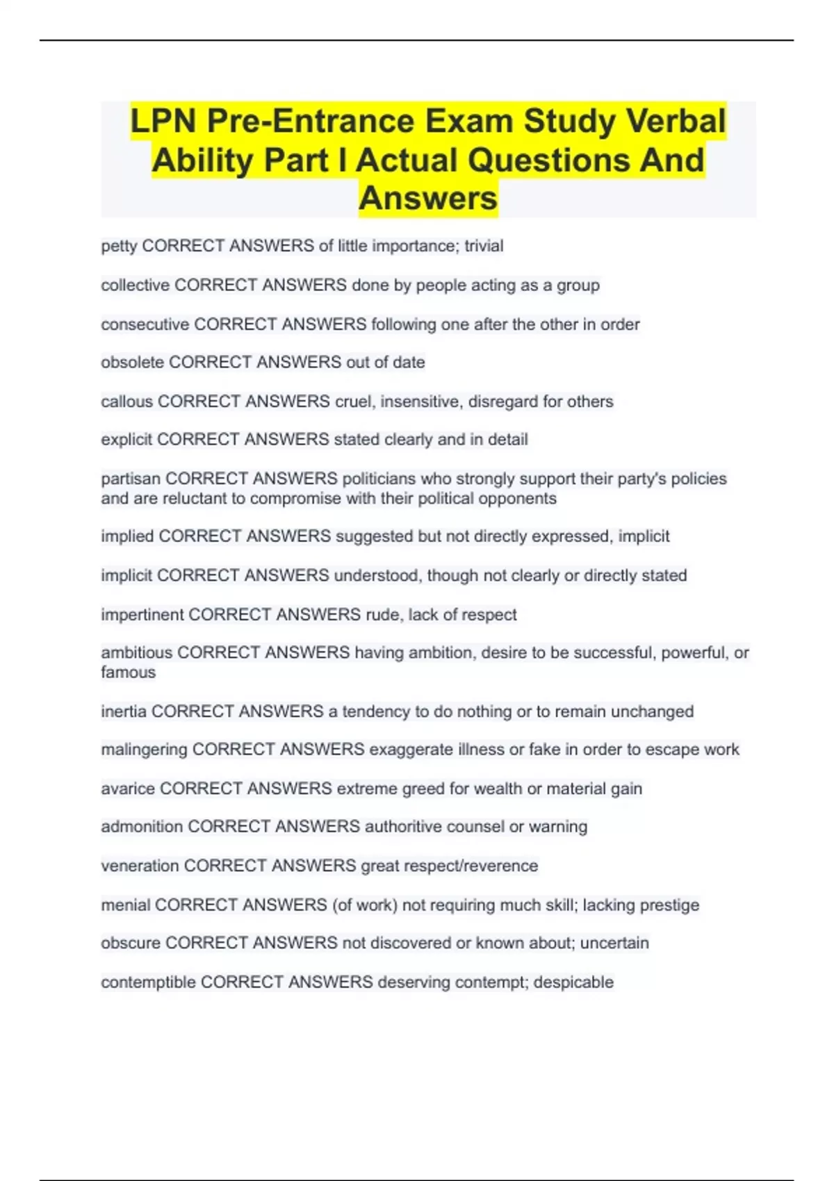 LPN Pre-Entrance Exam Study Verbal Ability Part I Actual Questions And Answers