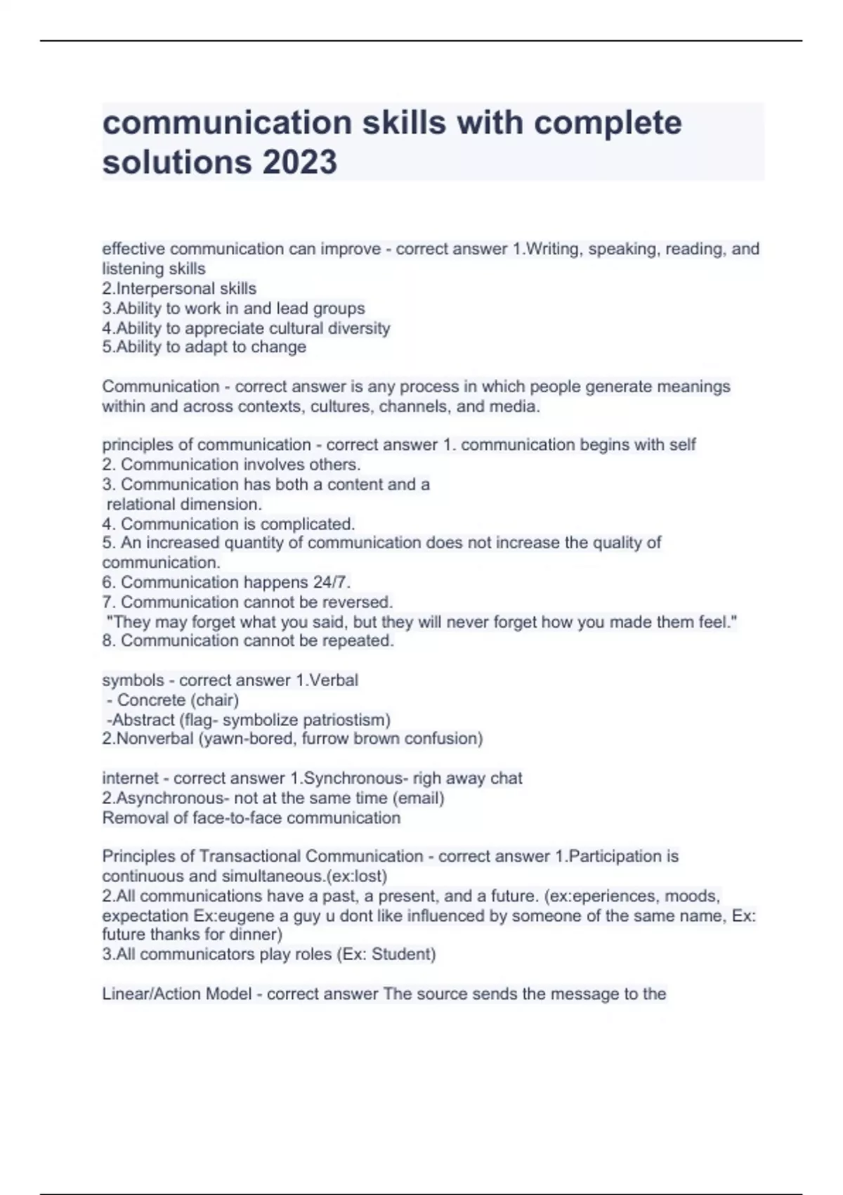 communication skills Questions with complete solution 2024effective communication can improve - correct answer 1.Writing, speaking, reading, and listening skills 2.Interpersonal skills 3.Ability to work in and lead groups 4.Ability to appreciate cultural diversity 5.Ability to adapt to change Communication - correct answer is any process in which people generate meanings within and across contexts, cultures, channels, and media. principles of communication - correct answer 1. communication begins with self 2. Communication involves others. 3. Communication has both a content and a relational dimension. 4. Communication is complicated. 5. An increased quantity of communication does not increase the quality of communication. 6. Communication happens 24/7. 7. Communication cannot be reversed. "They may forget what you said, but they will never forget how you made them feel." 8. Communication cannot be repeated. symbols - correct answer 1.Verbal - Concrete (chair) -Abstract (flag- symbolize patriostism) 2.Nonverbal (yawn-bored, furrow brown confusion)