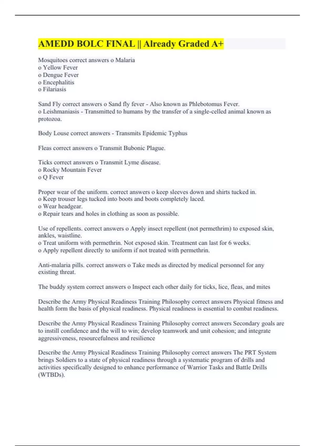 Mosquitoes correct answers o Malaria o Yellow Fever o Dengue Fever o Encephalitis o Filariasis Sand Fly correct answers o Sand fly fever - Also known as Phlebotomus Fever. o Leishmaniasis - Transmitted to humans by the transfer of a single-celled animal known as protozoa. Body Louse correct answers - Transmits Epidemic Typhus Fleas correct answers o Transmit Bubonic Plague. Ticks correct answers o Transmit Lyme disease. o Rocky Mountain Fever o Q Fever Proper wear of the uniform. correct answers o keep sleeves down and shirts tucked in. o Keep trouser legs tucked into boots and boots completely laced. o Wear headgear. o Repair tears and holes in clothing as soon as possible. Use of repellents. correct answers o Apply insect repellent (not permethrim) to exposed skin, ankles, waistline. o Treat uniform with permethrin. Not exposed skin. Treatment can last for 6 weeks. o Apply repellent directly to uniform if not treated with permethrin. Anti-malaria pills. correct answers o Take meds as directed by medical personnel for any existing threat. The buddy system correct answers o Inspect each other daily for ticks, lice, fleas, and mites Describe the Army Physical Readiness Training Philosophy correct answers Physical fitness and health form the basis of physical readiness. Physical readiness is essential to combat readiness. Describe the Army Physical Readiness Training Philosophy correct answers Secondary goals are to instill confidence and the will to win; develop teamwork and unit cohesion; and integrate aggressiveness, resourcefulness and resilience Describe the Army Physical Readiness Training Philosophy correct answers The PRT System brings Soldiers to a state of physical readiness through a systematic program of drills and activities specifically designed to enhance performance of Warrior Tasks and Battle Drills (WTBDs