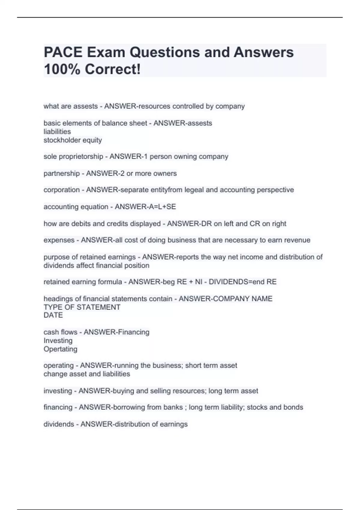 what are assests - ANSWER-resources controlled by company basic elements of balance sheet - ANSWER-assests liabilities stockholder equity sole proprietorship - ANSWER-1 person owning company partnership - ANSWER-2 or more owners corporation - ANSWER-separate entityfrom legeal and accounting perspective accounting equation - ANSWER-A=L+SE how are debits and credits displayed - ANSWER-DR on left and CR on right expenses - ANSWER-all cost of doing business that are necessary to earn revenue purpose of retained earnings - ANSWER-reports the way net income and distribution of dividends affect financial position retained earning formula - ANSWER-beg RE + NI - DIVIDENDS=end RE headings of financial statements contain - ANSWER-COMPANY NAME TYPE OF STATEMENT DATE cash flows - ANSWER-Financing Investing Opertating