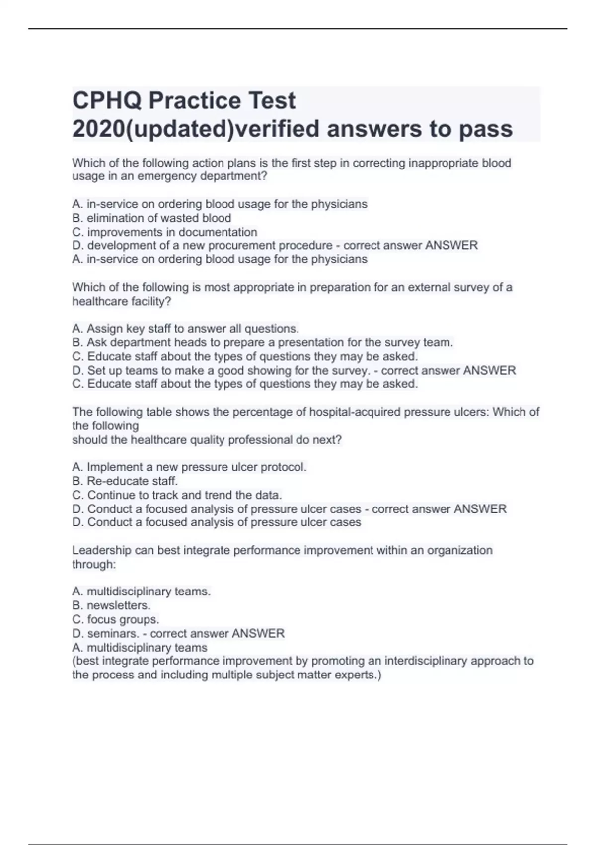 CPHQ Practice Test 2020(updated) Question and answers already passed Which of the following action plans is the first step in correcting inappropriate blood usage in an emergency department? A. in-service on ordering blood usage for the physicians B. elimination of wasted blood C. improvements in documentation D. development of a new procurement procedure - correct answer ANSWER A. in-service on ordering blood usage for the physicians Which of the following is most appropriate in preparation for an external survey of a healthcare facility? A. Assign key staff to answer all questions. B. Ask department heads to prepare a presentation for the survey team. C. Educate staff about the types of questions they may be asked. D. Set up teams to make a good showing for the survey. - correct answer ANSWER C. Educate staff about the types of questions they may be asked. The following table shows the percentage of hospital-acquired pressure ulcers: Which of the following should the healthcare quality professional do next? A. Implement a new pressure ulcer protocol. B. Re-educate staff. C. Continue to track a