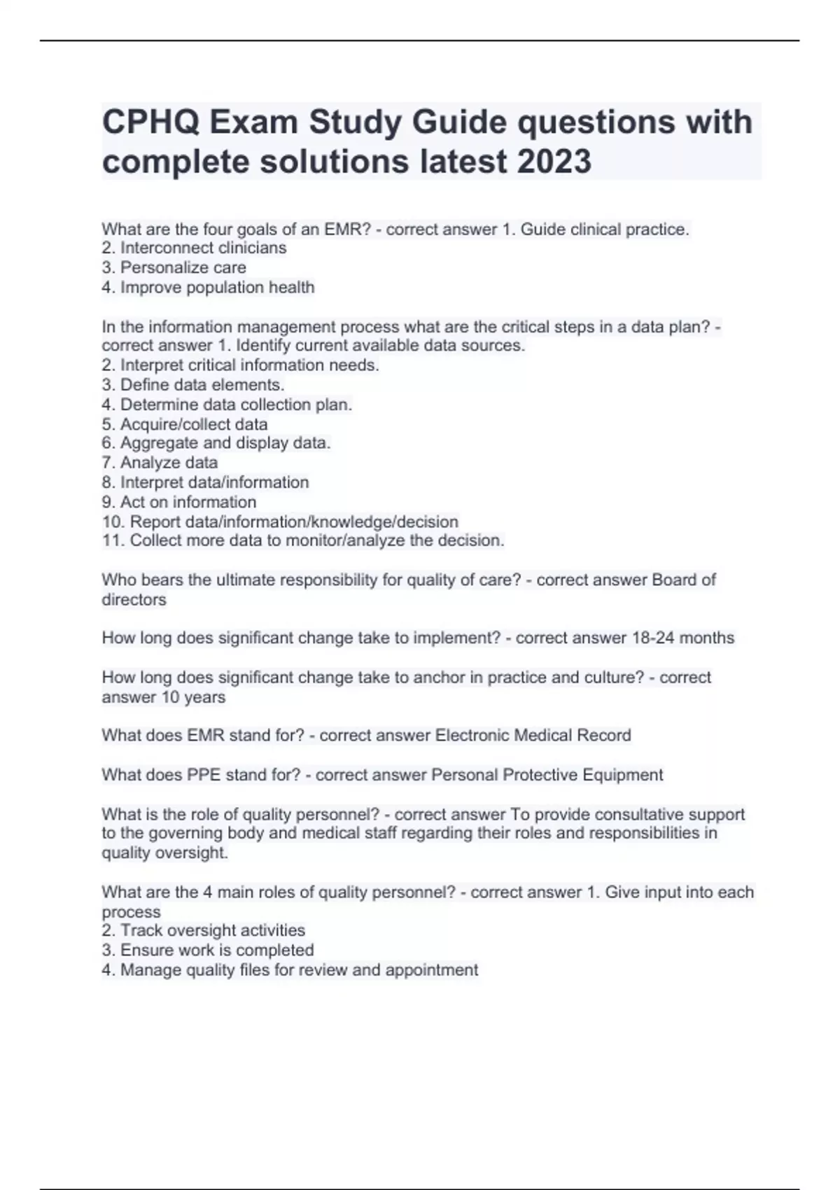 CPHQ Exam Study Guide questions with complete solution 2024What are the four goals of an EMR? - correct answer 1. Guide clinical practice. 2. Interconnect clinicians 3. Personalize care 4. Improve population health In the information management process what are the critical steps in a data plan? - correct answer 1. Identify current available data sources. 2. Interpret critical information needs. 3. Define data elements. 4. Determine data collection plan. 5. Acquire/collect data 6. Aggregate and display data. 7. Analyze data 8. Interpret data/information 9. Act on information 10. Report data/information/knowledge/decision 11. Collect more data to monitor/analyze the decision. Who bears the ultimate responsibility for quality of care? - correct answer Board of directors How long does significant change take to implement? - correct answer 18-24 months How long does significant change take to anchor in practice and culture? - correct answer 10 years What does EMR stand for? - correct answer Electronic Medical Record What does PPE stand for? - correct answer Personal Protective Equipment What is the role of quality personnel? - correct answer To provide consultative support to the governing body and medical staff regarding their roles and responsibilities in quality oversight. What are the 4 main roles of quality personnel? - correct answer 1. Give input into each process 2. Track oversight activities 3. Ensure work is completed 4. Manage quality files for review and appointment