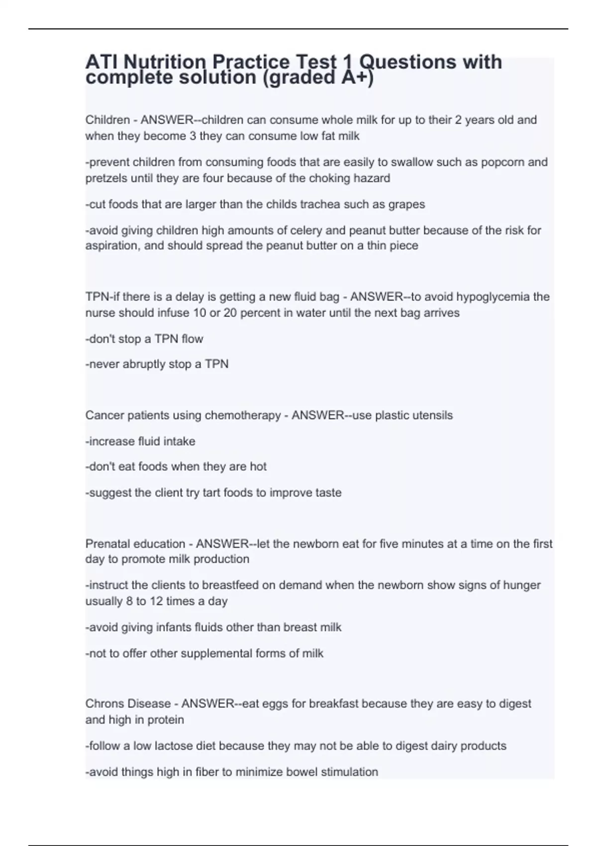 Children - ANSWER--children can consume whole milk for up to their 2 years old and when they become 3 they can consume low fat milk -prevent children from consuming foods that are easily to swallow such as popcorn and pretzels until they are four because of the choking hazard -cut foods that are larger than the childs trachea such as grapes -avoid giving children high amounts of celery and peanut butter because of the risk for aspiration, and should spread the peanut butter on a thin piece TPN-if there is a delay is getting a new fluid bag - ANSWER--to avoid hypoglycemia the nurse should infuse 10 or 20 percent in water until the next bag arrives -don't stop a TPN flow -never abruptly stop a TPN Cancer patients using chemotherapy - ANSWER--use plastic utensils -increase fluid intake -don't eat foods when they are hot -suggest the client try tart foods to improve taste Prenatal education - ANSWER--let the newborn eat for five minutes at a time on the first day to promote milk production -instruct the clients to breastfeed on demand when the newborn show signs of hunger usually 8 to 12 times a day -avoid giving infants fluids other than breast milk -not to offer other supplemental forms of milk Chrons Disease - ANSWER--eat eggs for breakfast because they are easy to digest and high in protein -follow a low lactose diet because they may not be able to digest dairy products -avoid things high in fiber to minimize bowel stimulation -avoid snacks and canned fruits and any other containing high fructose