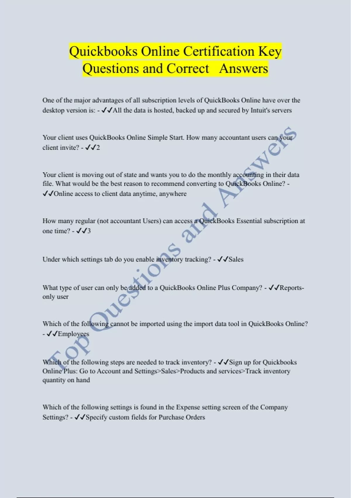 Quickbooks Online Certification Key Questions and Correct Answers