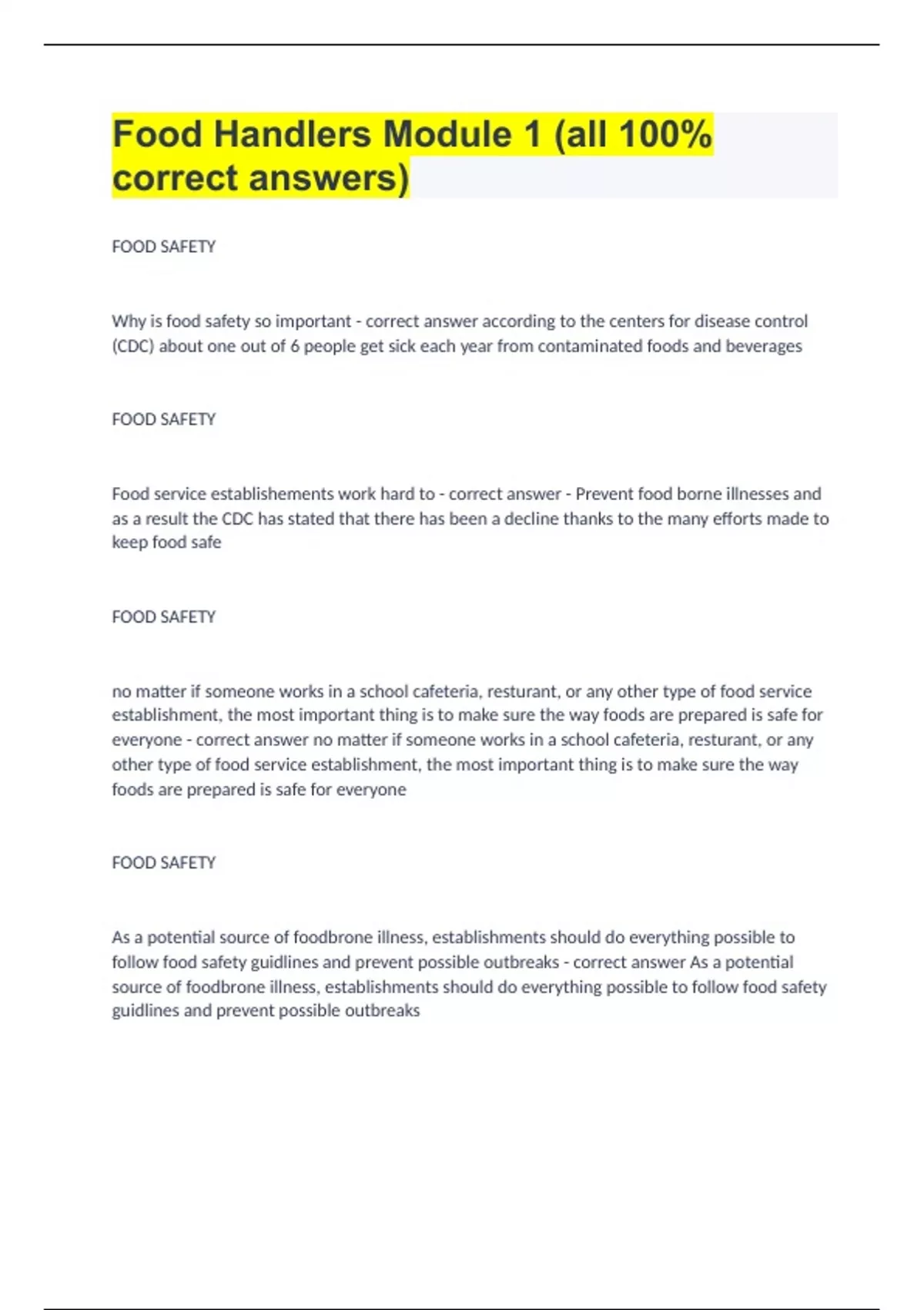 Module 1 (all 100% correct answers) FOOD SAFETY Food Handlers Why is food safety so important - correct answer according to the centers for disease control (CDC) about one out of 6 people get sick each year from contaminated foods and beverages FOOD SAFETY Food service establishements work hard to - correct answer - Prevent food borne illnesses and as a result the CDC has stated that there has been a decline thanks to the many efforts made to keep food safe FOOD SAFETY no matter if someone works in a school cafeteria, resturant, or any other type of food service establishment, the most important thing is to make sure the way foods are prepared is safe for everyone - correct answer no matter if someone works in a school cafeteria, resturant, or any other type of food service establishment, the most important thing is to make sure the way foods are prepared is safe for everyone FOOD SAFETY As a potential source of foodbrone illness, establishments should do everything possible to follow food safety guidlines and prevent possible outbreaks - correct answer As a potential source of foodbrone illness, establishments should do everything possible to follow food safety guidlines and prevent possible outbreaks FOODBORNE INFECTION - correct answer A foodborne infection is caused by eating foods that contain harmful microorganisms FOODBORNE INTOXICATION - correct answer A foodborne intoxication is the result of eating foods containing toxins that cause illness FOODBORNE ILLNESSES What is a foodborne illness? - correct answer a disease transmitted to people by food FOODBORNE ILLNESSES A foodborne illness outbreak - correct answer when two or more people get the same illness after eating the same food FOODBORNE ILLNESSES Education on food safety recognizing the hazards that can contribute to food safety