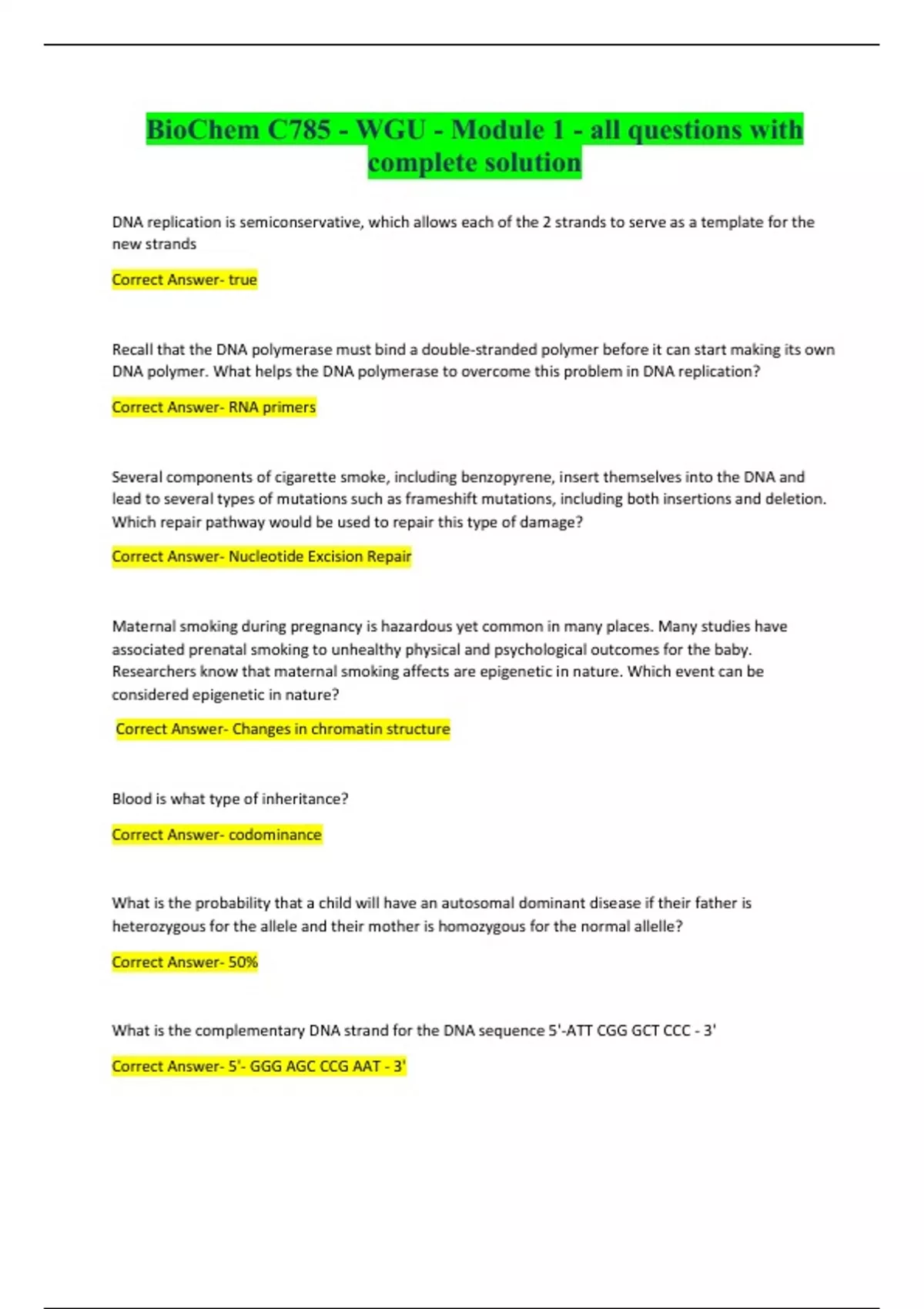 DNA replication is semiconservative, which allows each of the 2 strands to serve as a template for the new strands Correct Answer- true Recall that the DNA polymerase must bind a double-stranded polymer before it can start making its own DNA polymer. What helps the DNA polymerase to overcome this problem in DNA replication? Correct Answer- RNA primers Several components of cigarette smoke, including benzopyrene, insert themselves into the DNA and lead to several types of mutations such as frameshift mutations, including both insertions and deletion. Which repair pathway would be used to repair this type of damage? Correct Answer- Nucleotide Excision Repair Maternal smoking during pregnancy is hazardous yet common in many places. Many studies have associated prenatal smoking to unhealthy physical and psychological outcomes for the baby. Researchers know that maternal smoking affects are epigenetic in nature. Which event can be considered epigenetic in nature? Correct Answer- Changes in chromatin structure Blood is what type of inheritance? Correct Answer- codominance What is the probability that a child will have an autosomal dominant disease if their father is heterozygous for the allele and their mother is homozygous for the normal allelle? Correct Answer- 50% What is the complementary DNA strand for the DNA sequence 5'-ATT CGG GCT CCC - 3' Correct Answer- 5'- GGG AGC CCG AAT - 3'